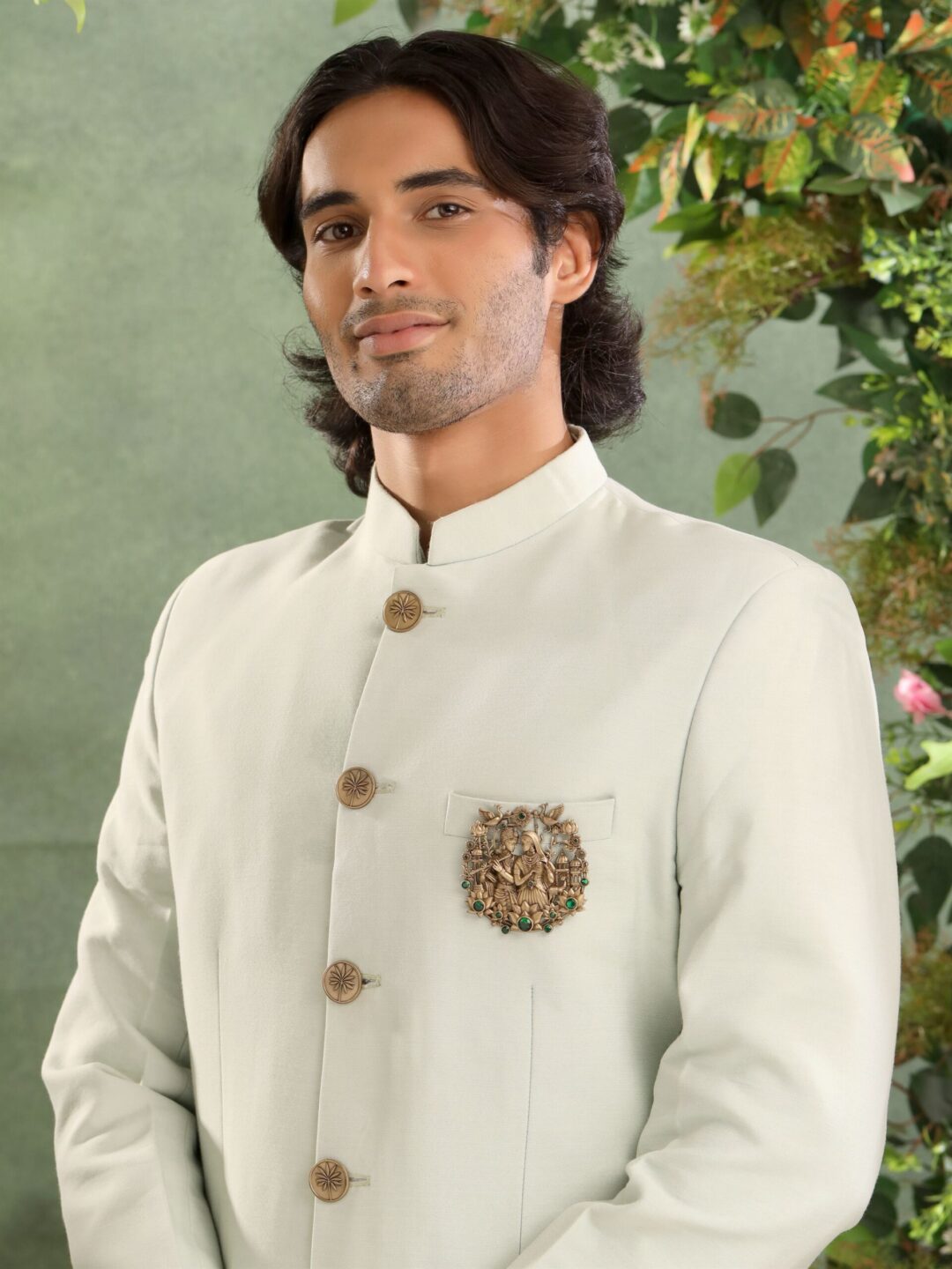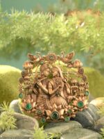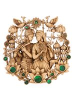 This brooch intricately captures the essence of Radha and Krishna’s love, with finely detailed craftsmanship. The figures of Radha and Krishna are encircled by flourishing lotuses, a symbol of purity and beauty. The detailing of their garments and ornaments showcases the finesse of traditional Indian artistry. The addition of peacocks, known for their grace and association with beauty in Indian culture, enhances the visual appeal, while the domed temple structures in the background pay homage to Indian architectural heritage. The green gemstones embedded in the design add a vibrant contrast, symbolizing growth, prosperity, and life. This brooch is a celebration of romance, divinity, and heritage, making it a profound piece of wearable art that bridges history with personal adornment.