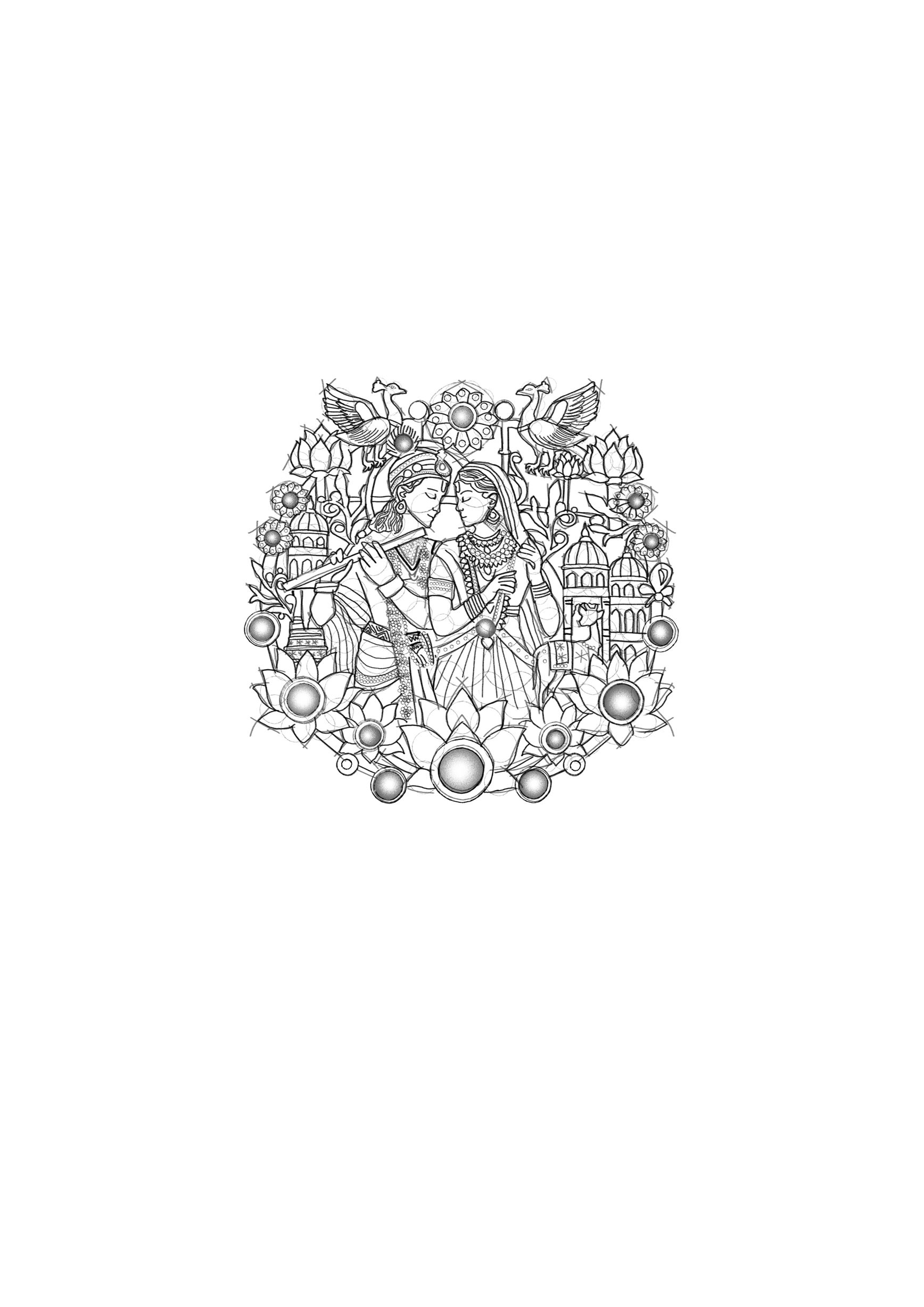 This brooch draws inspiration from the timeless love story of Radha and Krishna, a tale deeply rooted in Indian mythology and cultural history. Radha and Krishna symbolize divine love and spiritual unity, which has been a recurrent theme in Indian art, music, and poetry for centuries. The scene depicted here showcases Krishna playing his flute, with Radha mesmerized by his music, symbolizing their eternal bond. The presence of lotuses and peacocks further enhances the traditional Indian motifs often associated with purity, grace, and divine love. The architecture of temples in the background echoes the classical Indian temple art style, linking the scene to the divine and sacred landscapes of ancient India.