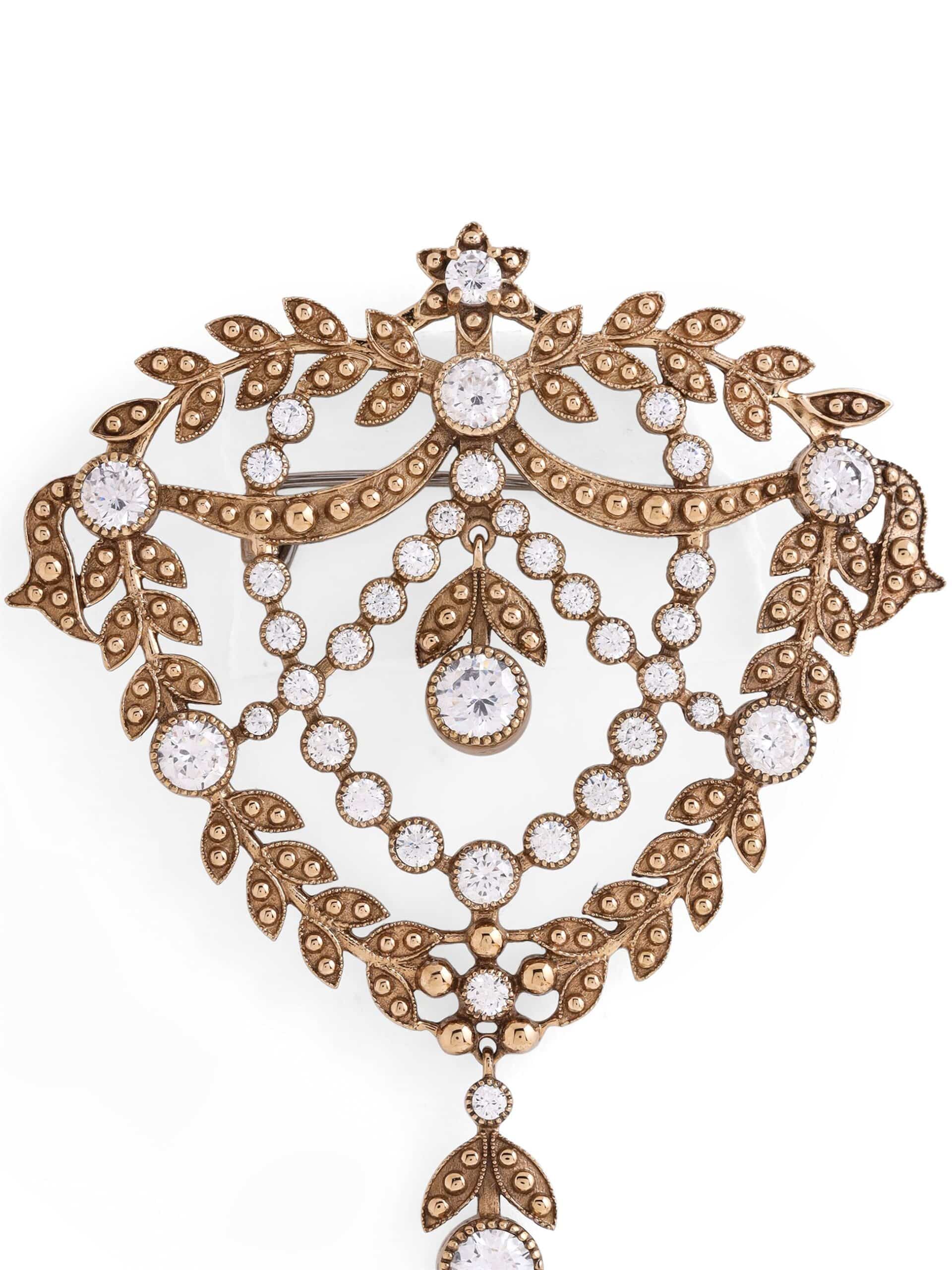 Elite Enigma Brooch boasts a mix of botanical patterns, delicate bows, and sparkling studs, making it an exquisite addition to elevate your attire and make a statement of enduring grace and mystique. It seamlessly combines the intricate allure of leaf motifs, the graceful charm of bows, and the vintage sophistication of studs.