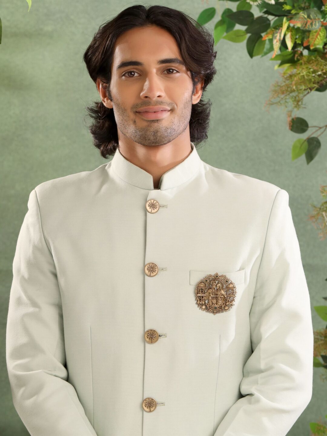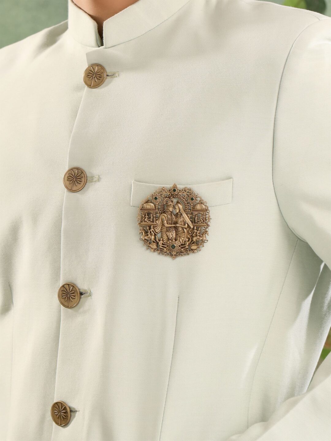 Celebrate the divine connection of eternal love with this exquisitely detailed brooch, depicting a celestial couple surrounded by intricate motifs. The green stones enhance its rich, detailed design. This lightweight brooch can be stitched onto coats, jackets, or bandhagalas, offering a touch of historical opulence and grace.