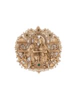 The design features Radha and Krishna in a loving embrace, surrounded by intricate architectural elements like domes and pillars, reminiscent of traditional temple carvings. The ornate detailing of their attire, adorned with fine patterns and embedded green stones, highlights the richness and intricacy of classic Indian jewelry design. The inclusion of animals, floral motifs, and filigree work enhances the overall aesthetic, creating a sense of depth and storytelling within the piece. This brooch serves as a miniature sculpture, blending artistic craftsmanship with cultural symbolism, making it a captivating accessory that celebrates divine love.