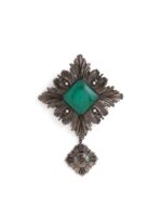 The brooch showcases a clean and modern aesthetic, anchored by the green gem that commands attention. Its understated form allows for effortless integration on various garments or accessories, while its well-proportioned dimensions ensure a stylish fit.
