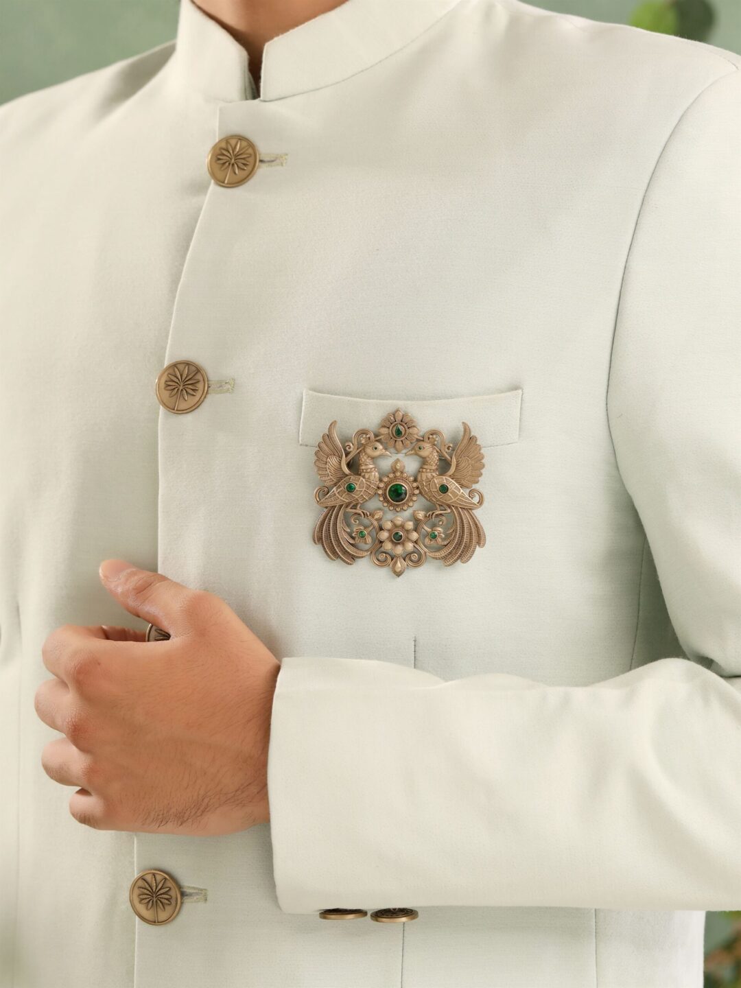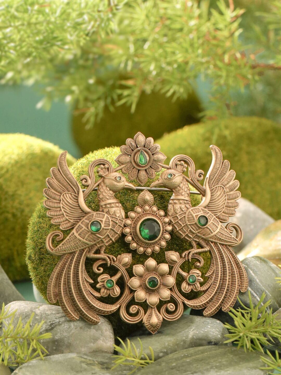 The brooch features two intricately designed peacocks facing one another, their wings spread wide in a majestic stance, evoking balance and symmetry. The center of the design is adorned with a radiant green gemstone, symbolizing prosperity and harmony, surrounded by delicate floral elements that complement the elegance of the birds