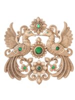 This brooch is inspired by the timeless elegance and symbolism of the peacock, a bird revered throughout history for its beauty and grace. In ancient Indian art and culture, the peacock has been a symbol of divinity, renewal, and immortality, often associated with royalty and divine protection. The dual peacock motif, with their feathers outstretched, pays tribute to this ancient heritage while celebrating nature?s vibrant forms. The floral designs woven throughout the brooch further highlight the deep connection between nature and the regal significance the peacock holds in cultural traditions.