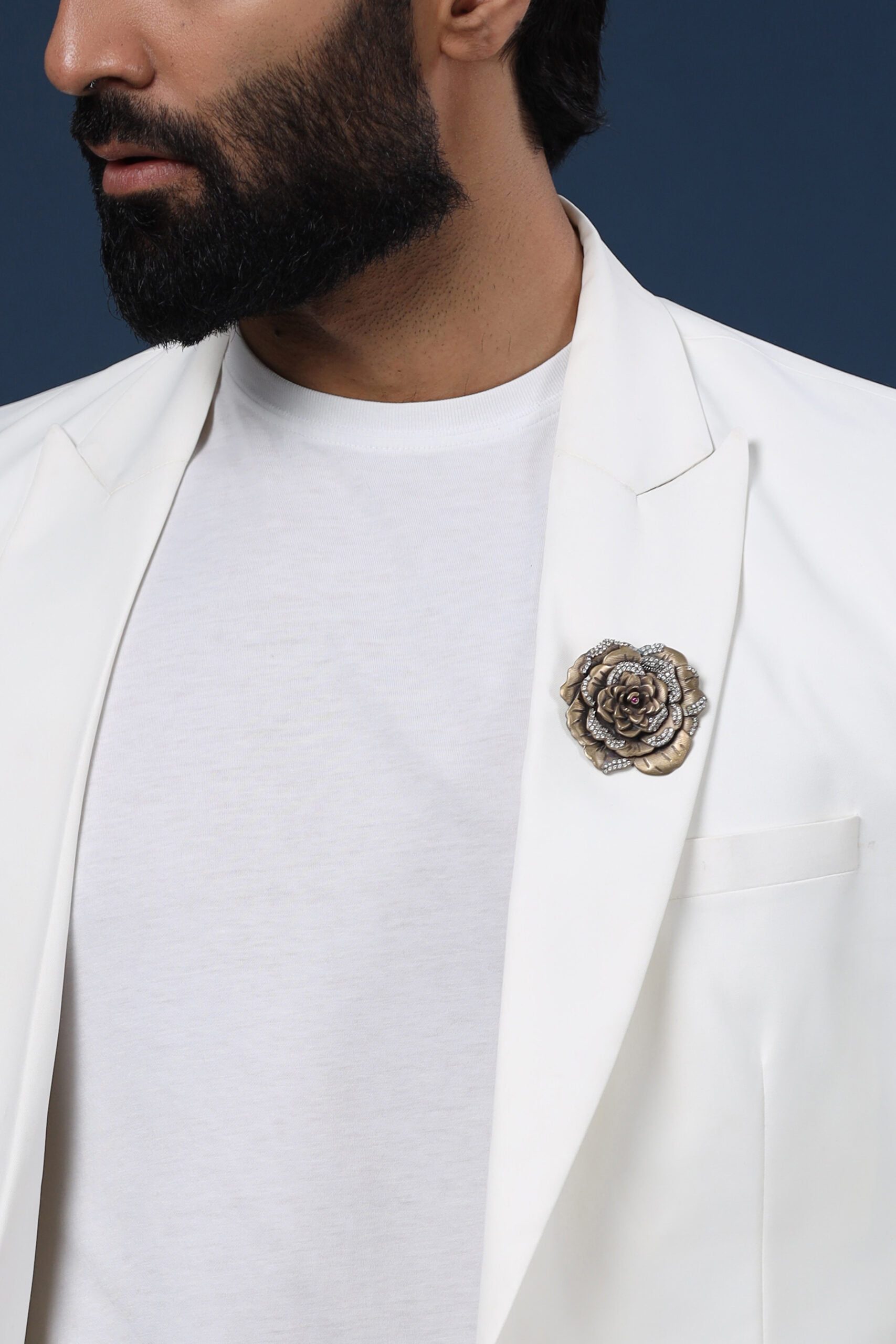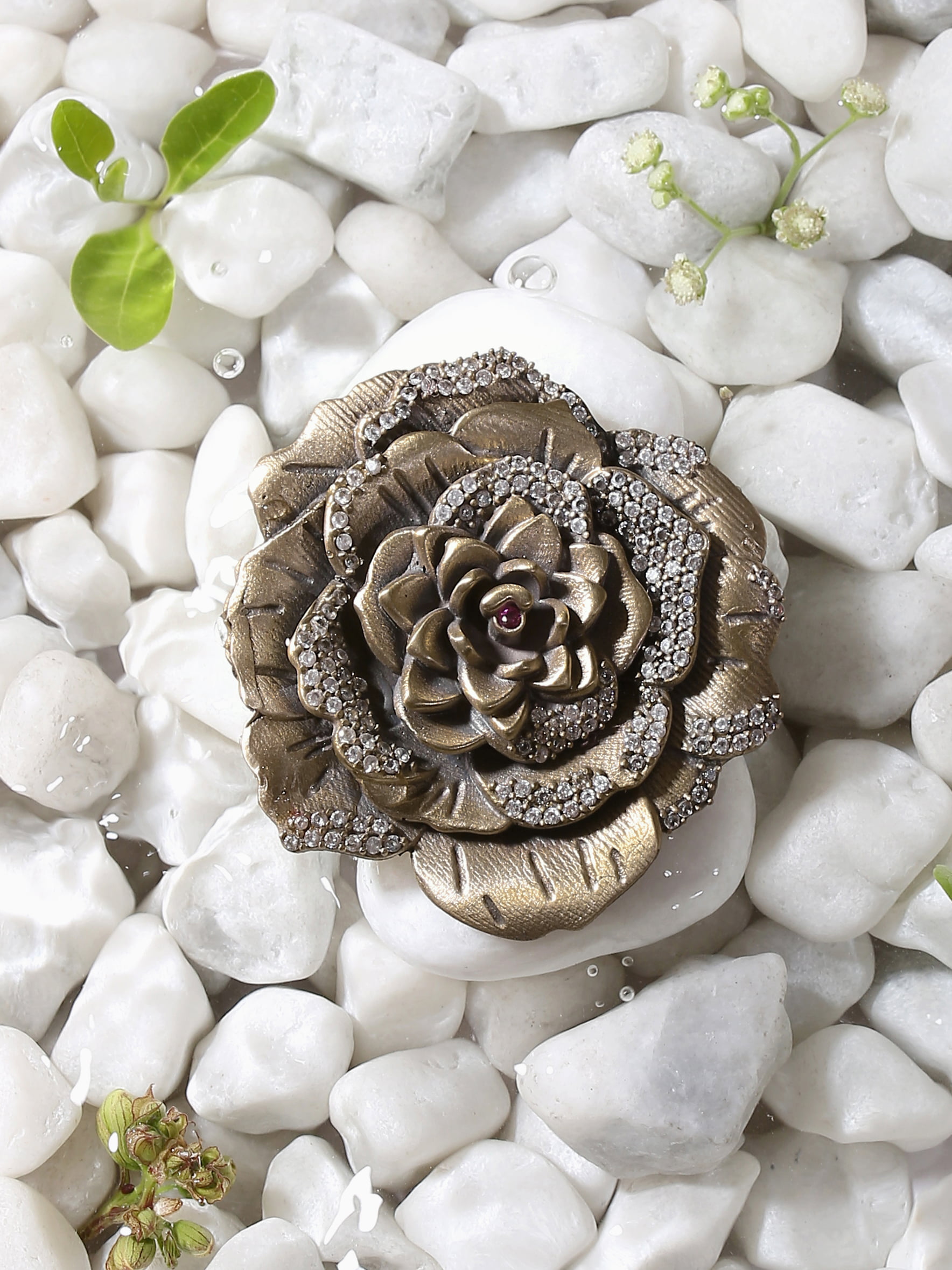 The Regal Rose is a grand, fully blossomed brass rose fixated with diamonds. The petals have been curated with an eye for detail. How the structure of the rose unfolds as it blooms is something that catches the attention of all. This brooch depicts the heart-warming vibes that you carry as you make a statement look.