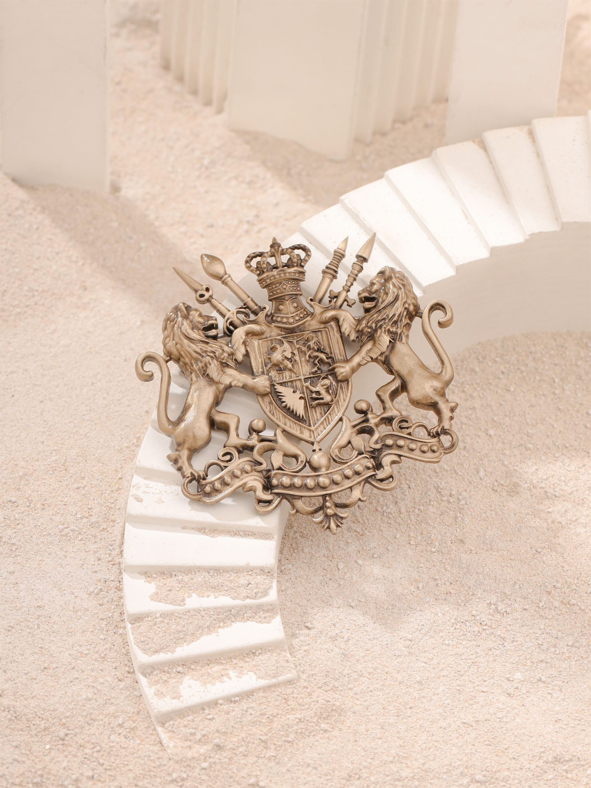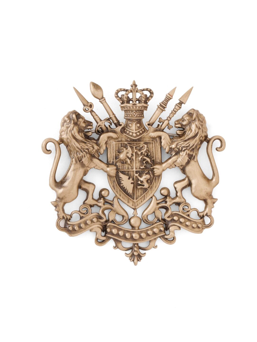 This brooch draws inspiration from the regal coats of arms that have historically symbolized authority and lineage among noble families and empires. The depiction of lions as heraldic supporters stems from their longstanding association with courage, strength, and guardianship, often seen flanking shields in the armorial bearings of kings and knights. The shield itself, a central element in this design, echoes the rich tradition of heraldry, where emblems and symbols were used to represent the virtues, achievements, and history of noble houses. The ornate crown atop the shield signifies leadership and the enduring legacy of nobility.