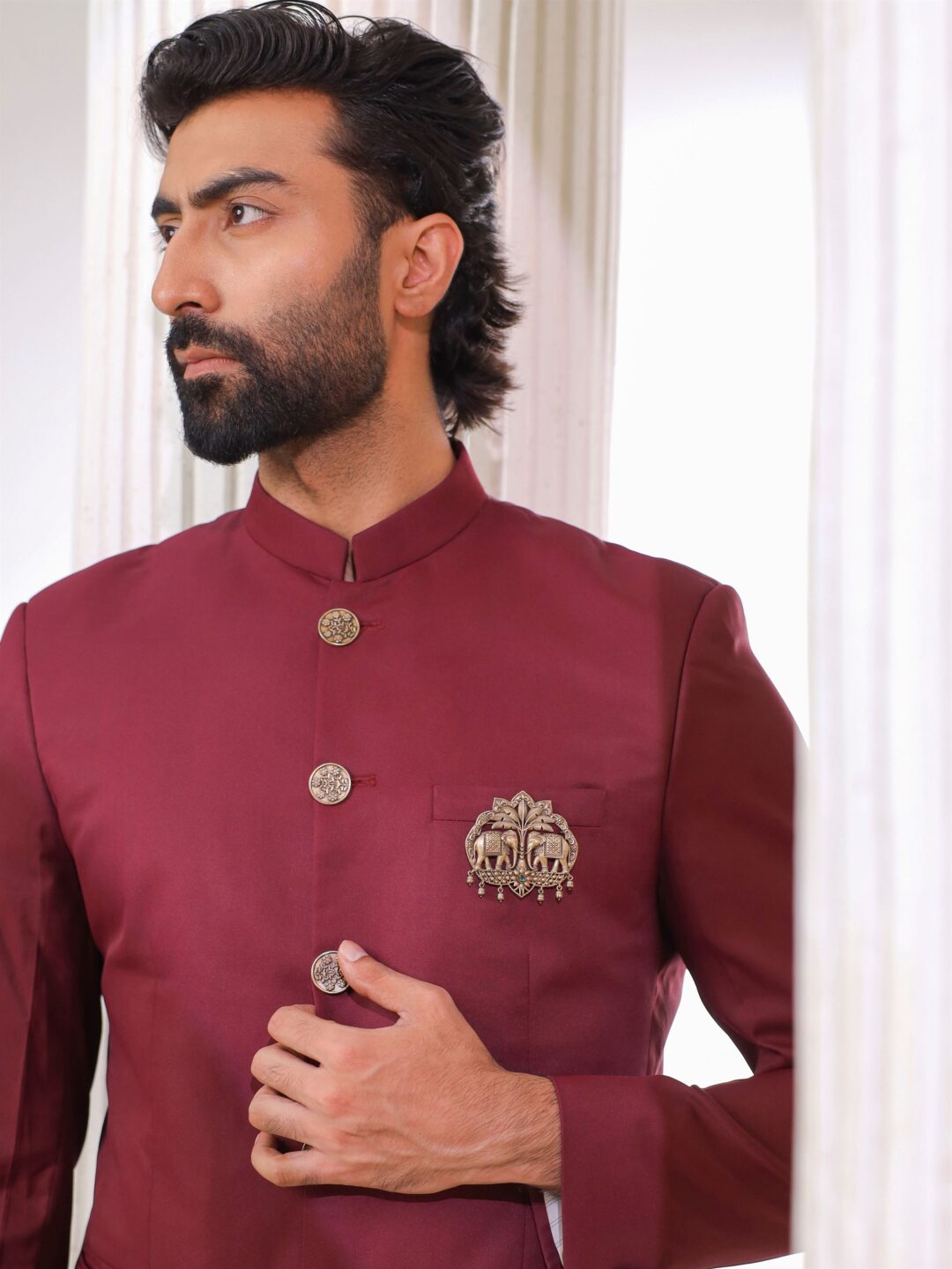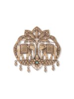 The Royal Elephant Duo Brooch embodies prosperity, wisdom, and heritage splendor. Crafted in antique-finished brass, it features two richly adorned elephants standing beneath a stylized palm tree, framed with intricate detailing. A floral motif set with an emerald-green stone at the base adds a touch of vibrance, while the hanging droplet elements enhance its grandeur. A perfect accessory for grooms and men of refined taste, this brooch brings a majestic presence to ceremonial and festive attire.