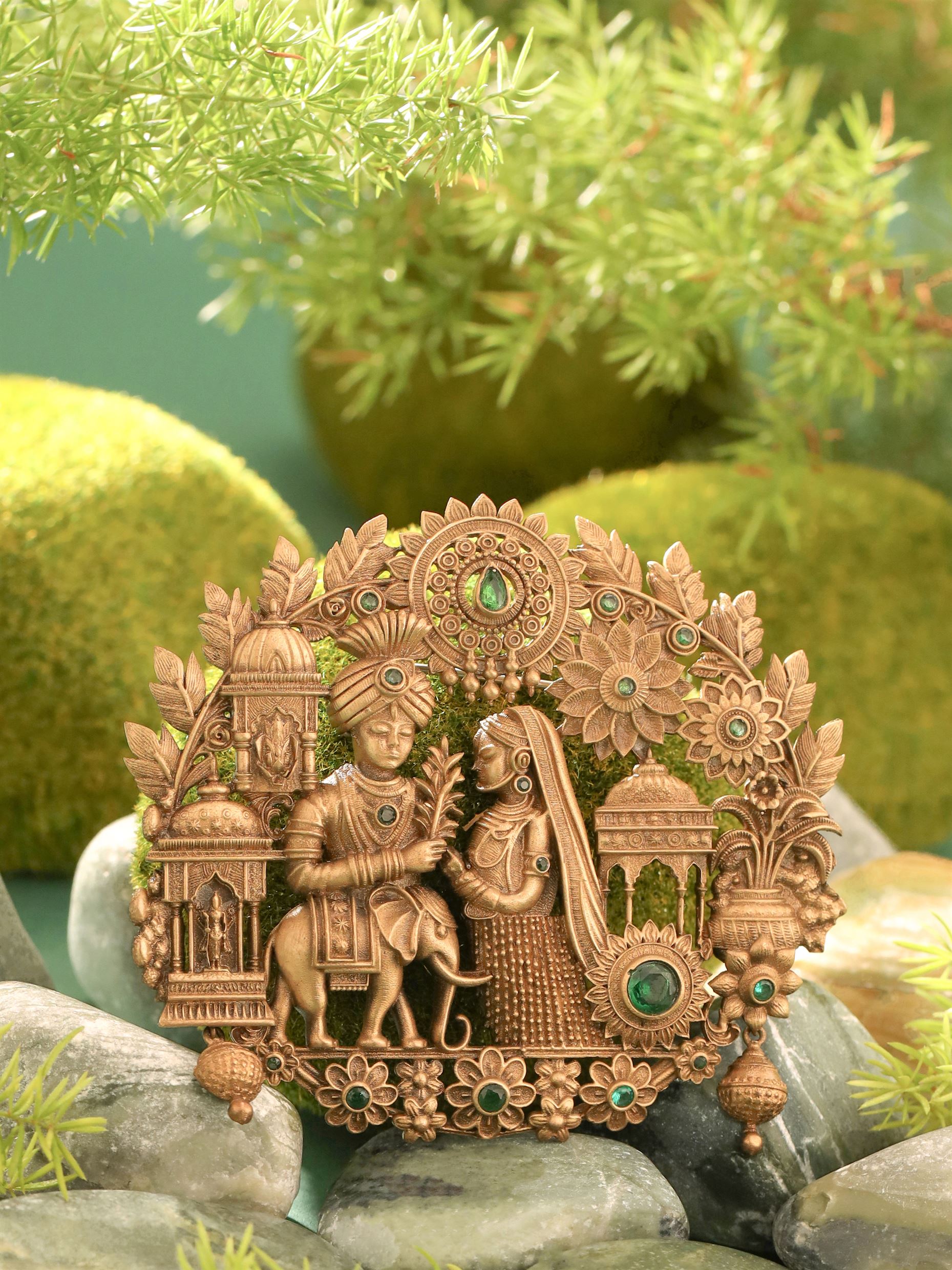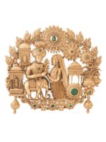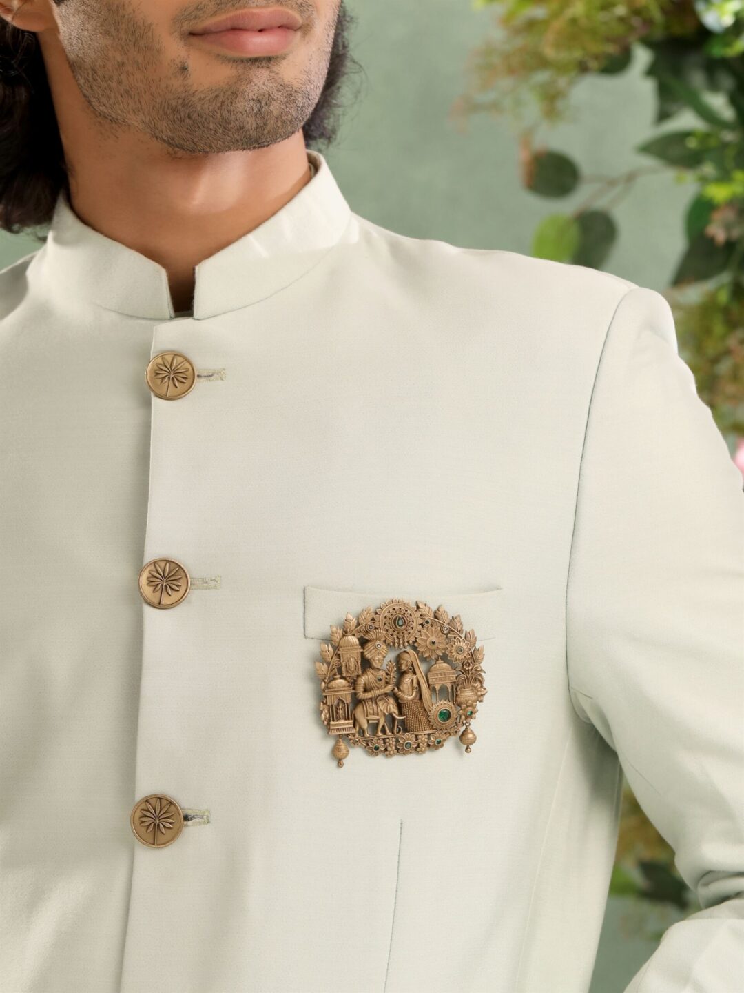 This brooch captures a timeless scene of elegance and tradition, intricately designed with motifs of a regal couple amidst a lush floral backdrop. Adorned with subtle green accents, this lightweight piece seamlessly enhances the sophistication of coats, jackets, and bandhgalas, making it an ideal accessory for those who appreciate refined craftsmanship and cultural artistry.