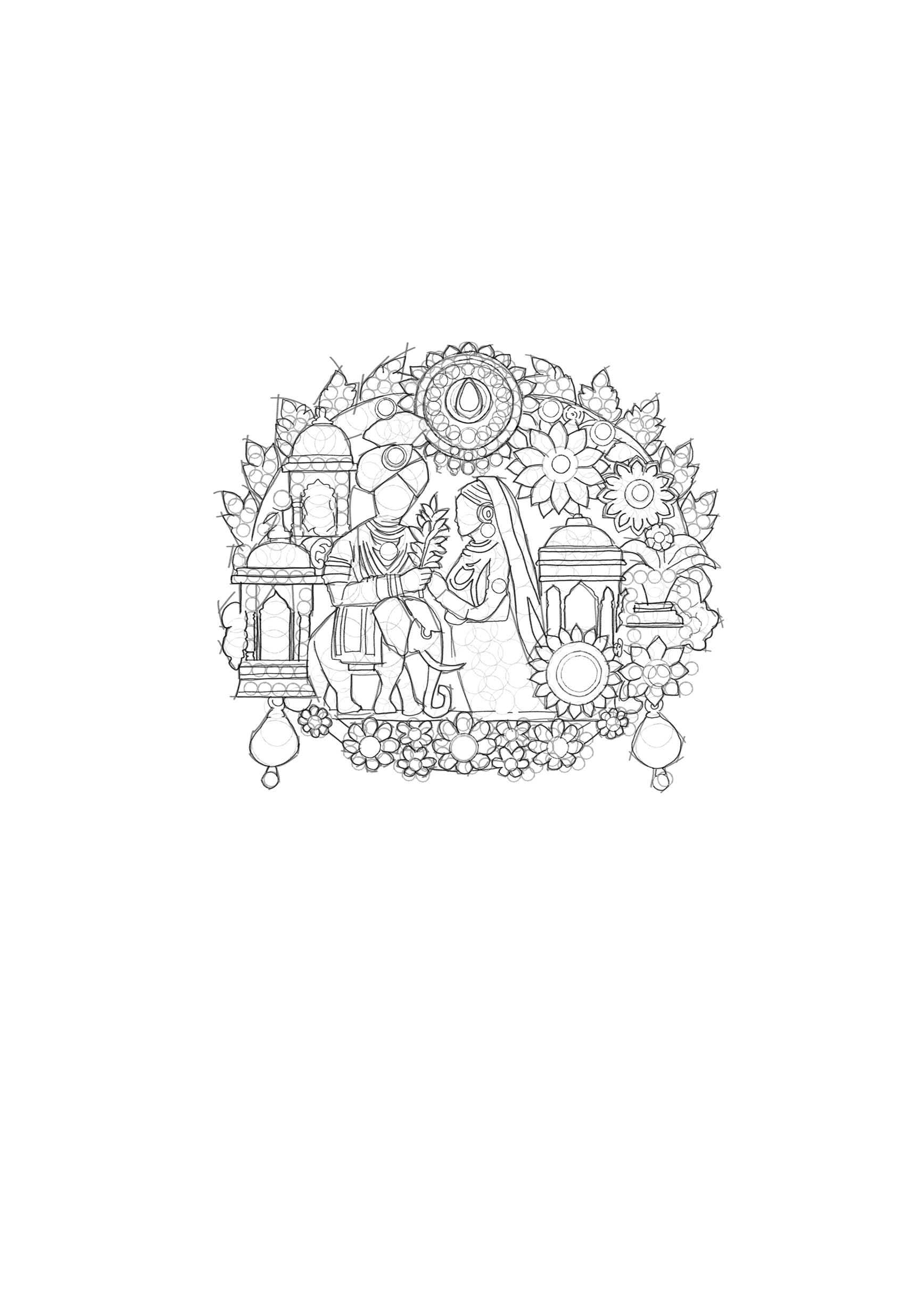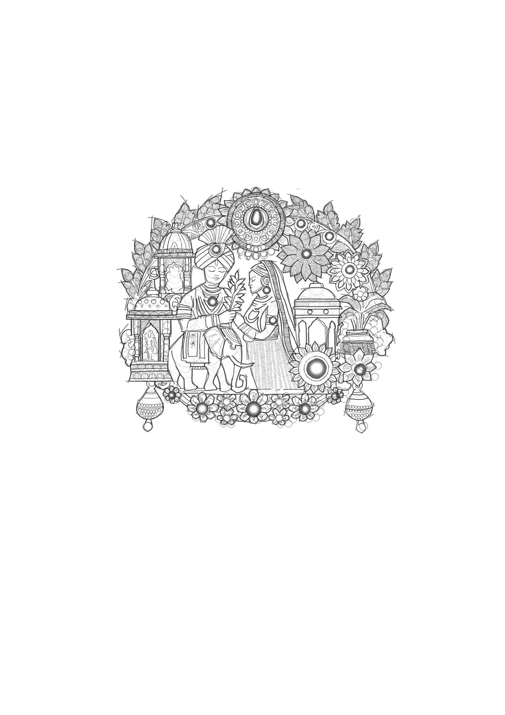 This brooch draws inspiration from the rich heritage of royal Indian weddings and court scenes, representing a timeless celebration of union, grandeur, and cultural elegance. The figures depicted on the brooch are reminiscent of the regal attire and customs seen in traditional Indian ceremonies, with the intricate detailing capturing a glimpse of the vibrant past. The inclusion of the elephant, which has long symbolized strength and prosperity in Indian culture, highlights the historical significance of the motif. The entire design is inspired by the artistry and craftsmanship from classical Indian palaces, where intricate floral patterns and architectural marvels were common.