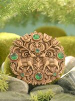 The brooch showcases two intricately adorned bulls, standing face-to-face, a depiction that suggests unity, balance, and protection. The bulls are encased in an elaborate array of floral motifs, symbolizing the connection between strength and nature?s nurturing power. The flowers surrounding the bulls bloom symmetrically, enhancing the piece’s harmony and balance, while the leaves weave throughout the design, drawing inspiration from the natural world?s cyclical patterns. The vibrant green gemstones set within the brooch represent fertility, vitality, and wealth. Overall, this piece marries the strength of the bull with the elegance of intricate floral patterns, blending motifs of power and beauty in a seamless and opulent design.
