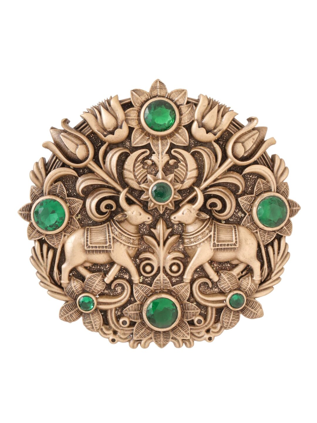This brooch takes its inspiration from ancient Indian and Southeast Asian art, particularly drawing upon the sacred symbolism of the bull. The depiction of bulls, or Nandi (the divine bull of Lord Shiva), is historically rooted in the ancient temples and palaces of India, where the bull symbolized strength, fertility, and steadfastness. In many ancient cultures, the bull is revered as a powerful force, a guardian of wealth, and a provider of abundance. The use of floral patterns surrounding the central figures reflects the influence of traditional temple carvings and nature?s divine beauty, a common theme in historical Indian craftsmanship and artistry. The intricate detailing paired with vibrant green gemstones brings out the essence of prosperity and growth, which were often associated with these sacred animals.