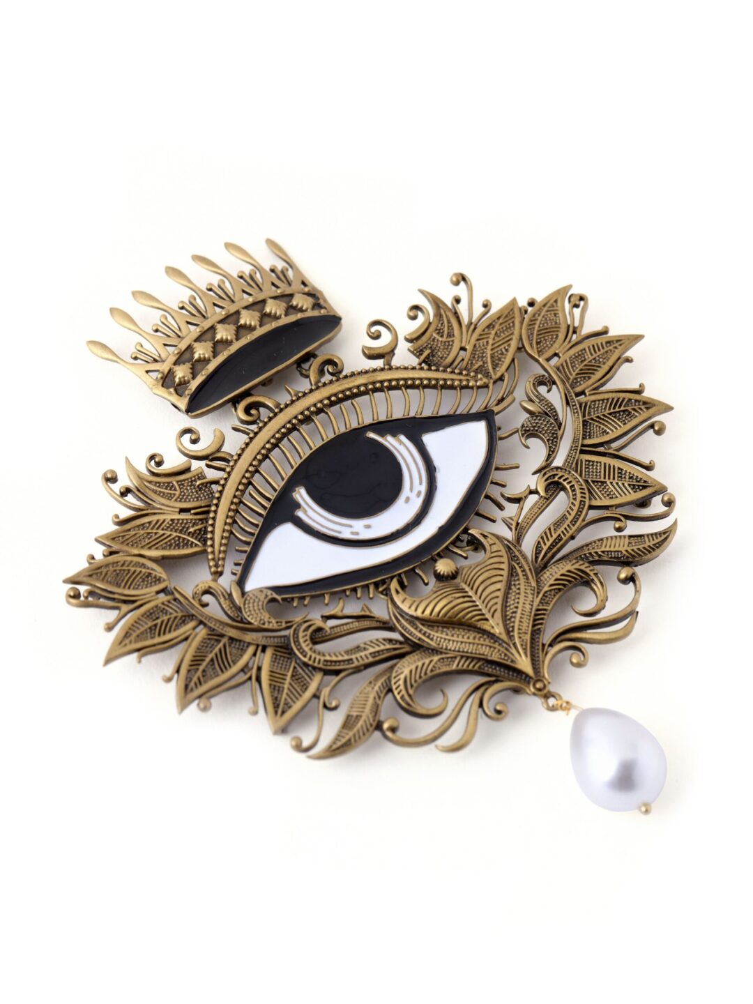 The Third Eye of Shiva brooch is a bewildering piece of jewellery handcrafted with devotion by Cosa Nostraa. It is a beautiful eye-shaped brooch fixated with a delicate pearl dangle at the bottom and a crown at the top. The eye expression has been given so realistically that it captures everyone’s attention.