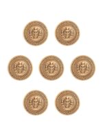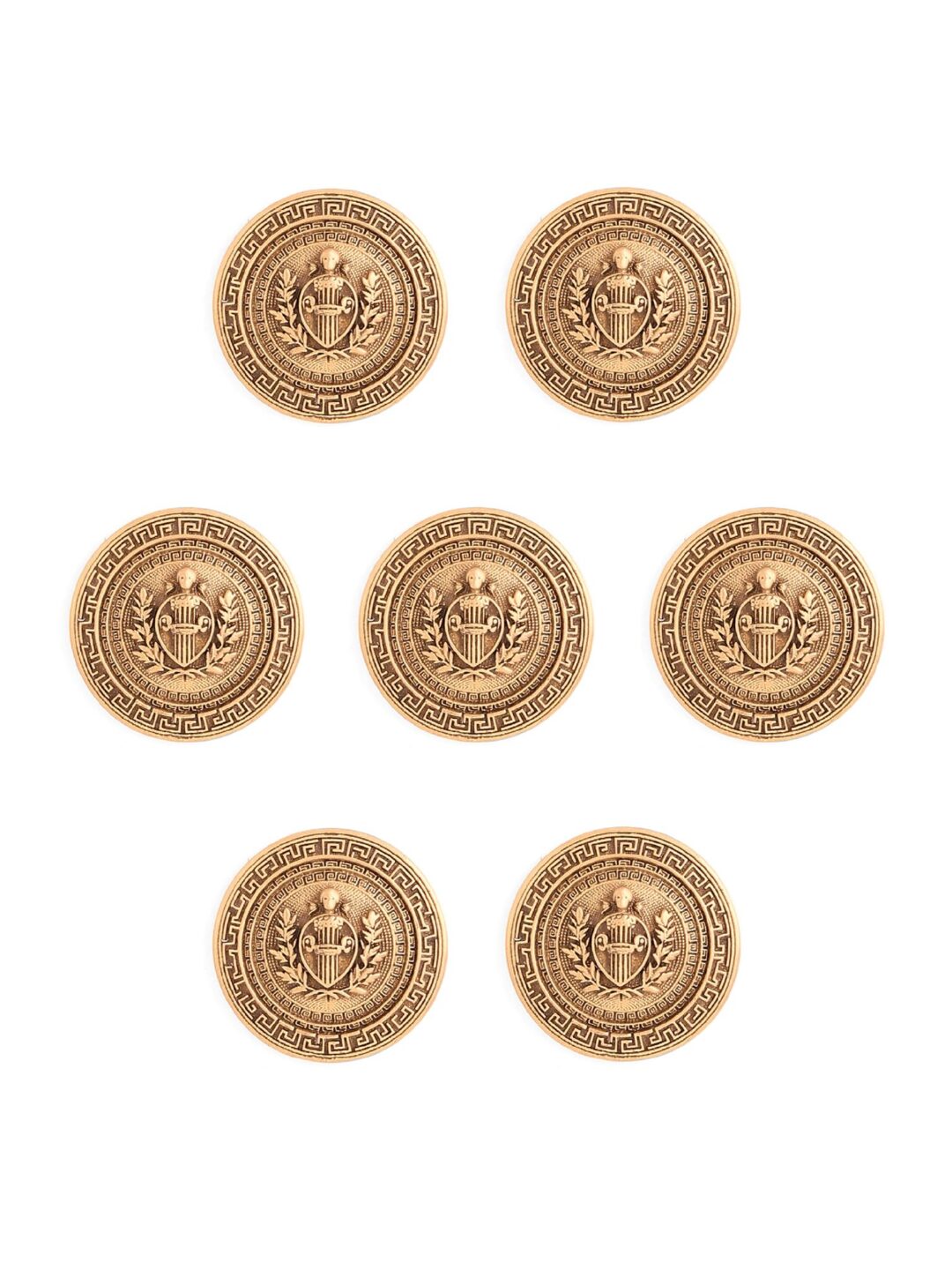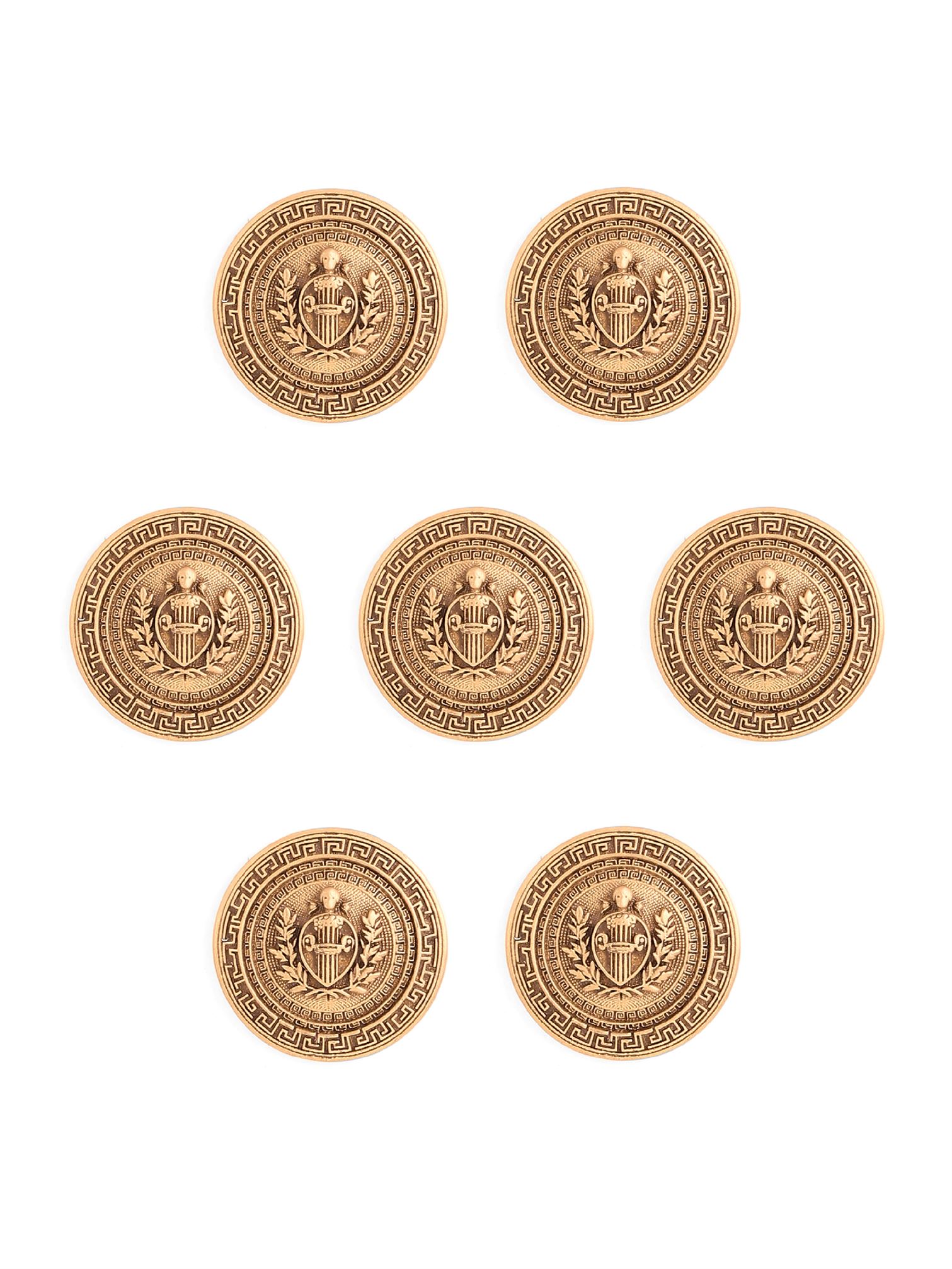 Elevate your style with our statement button featuring a polished gold shield design. With its geometric pattern and refined aesthetic, this accessory exudes confidence and sophistication, making it a versatile addition to any wardrobe.