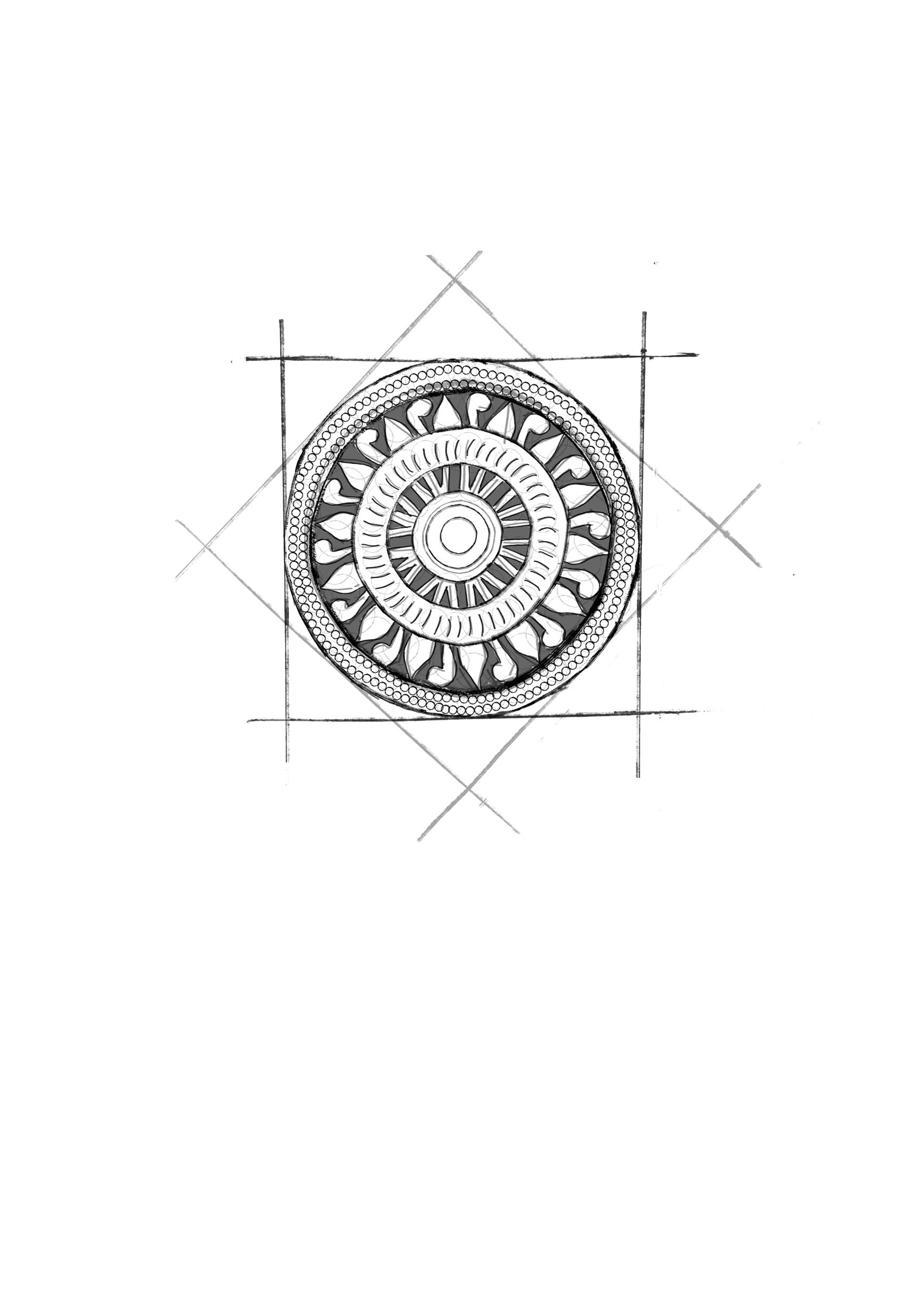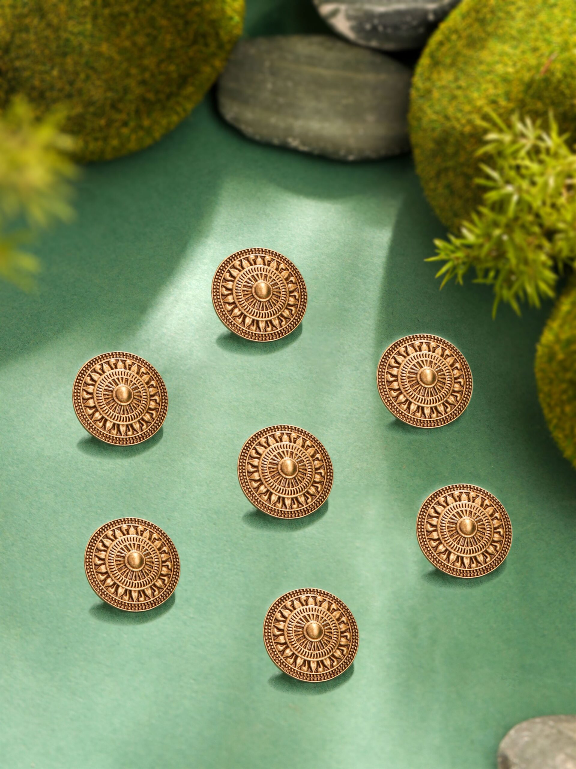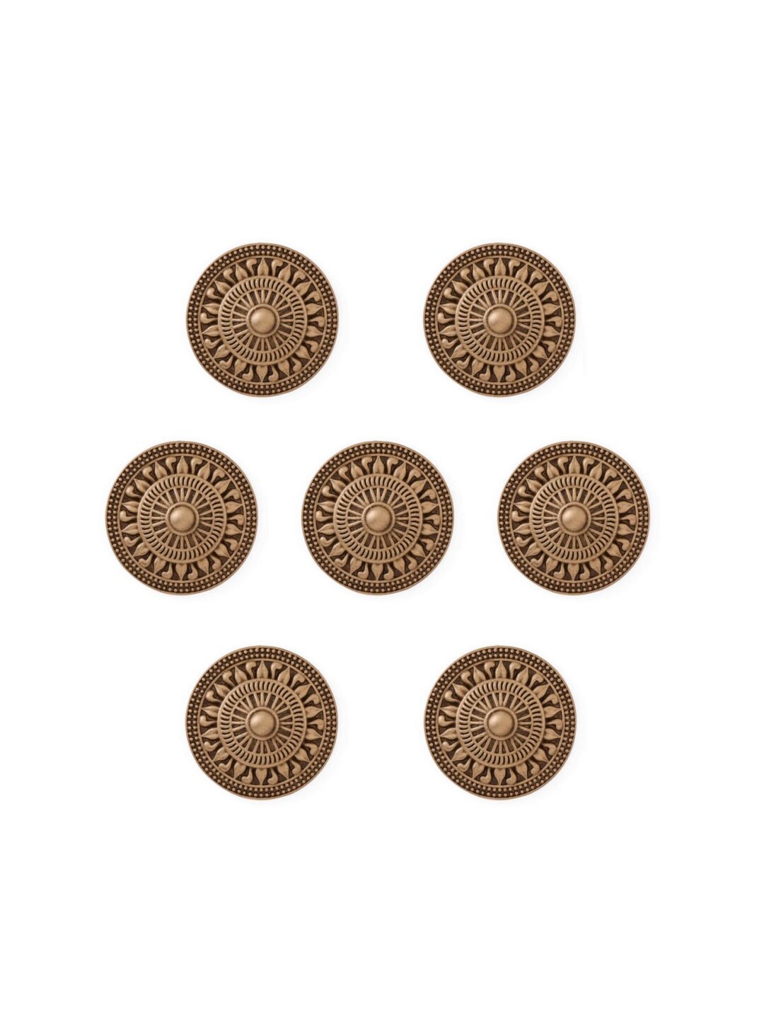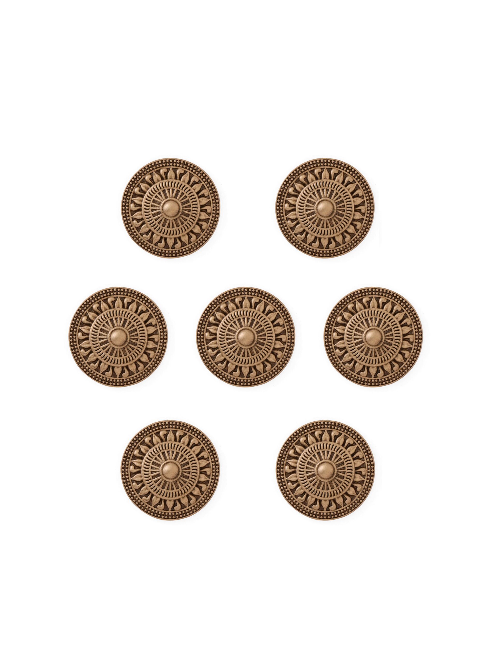 This button design is inspired by the ancient sun motifs found in many historical cultures, particularly those from India and Mesopotamia. The circular pattern with radiating elements represents the sun, a symbol of life, energy, and renewal. In ancient times, the sun was revered as the giver of life, and its depiction in art and architecture was often a mark of divinity and cosmic order. The use of radial symmetry in this design echoes the structure of historical shields and sacred wheels, like the Dharmachakra in Indian tradition, symbolizing eternal truth and cosmic cycles.