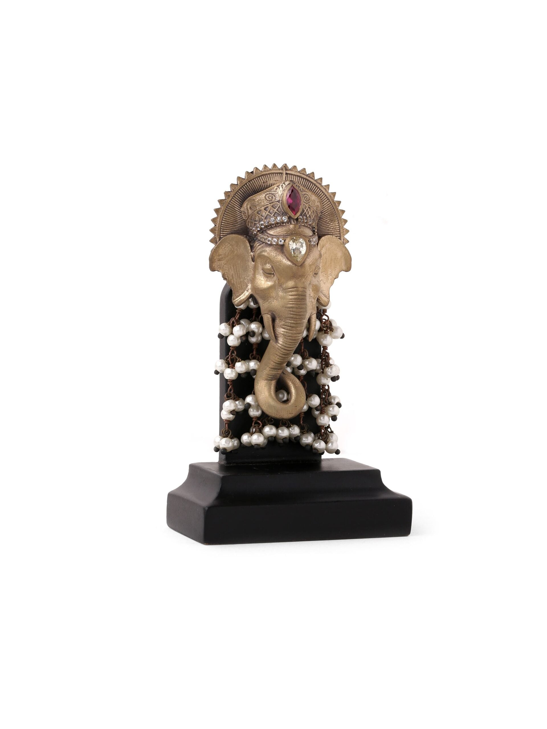 Amplify the beauty and spirituality of your space with this skilfully crafted piece, adorned with elegant gemstones and dangling pearls. Furnished in high quality brass, this idol also makes for an alluring car accessory.