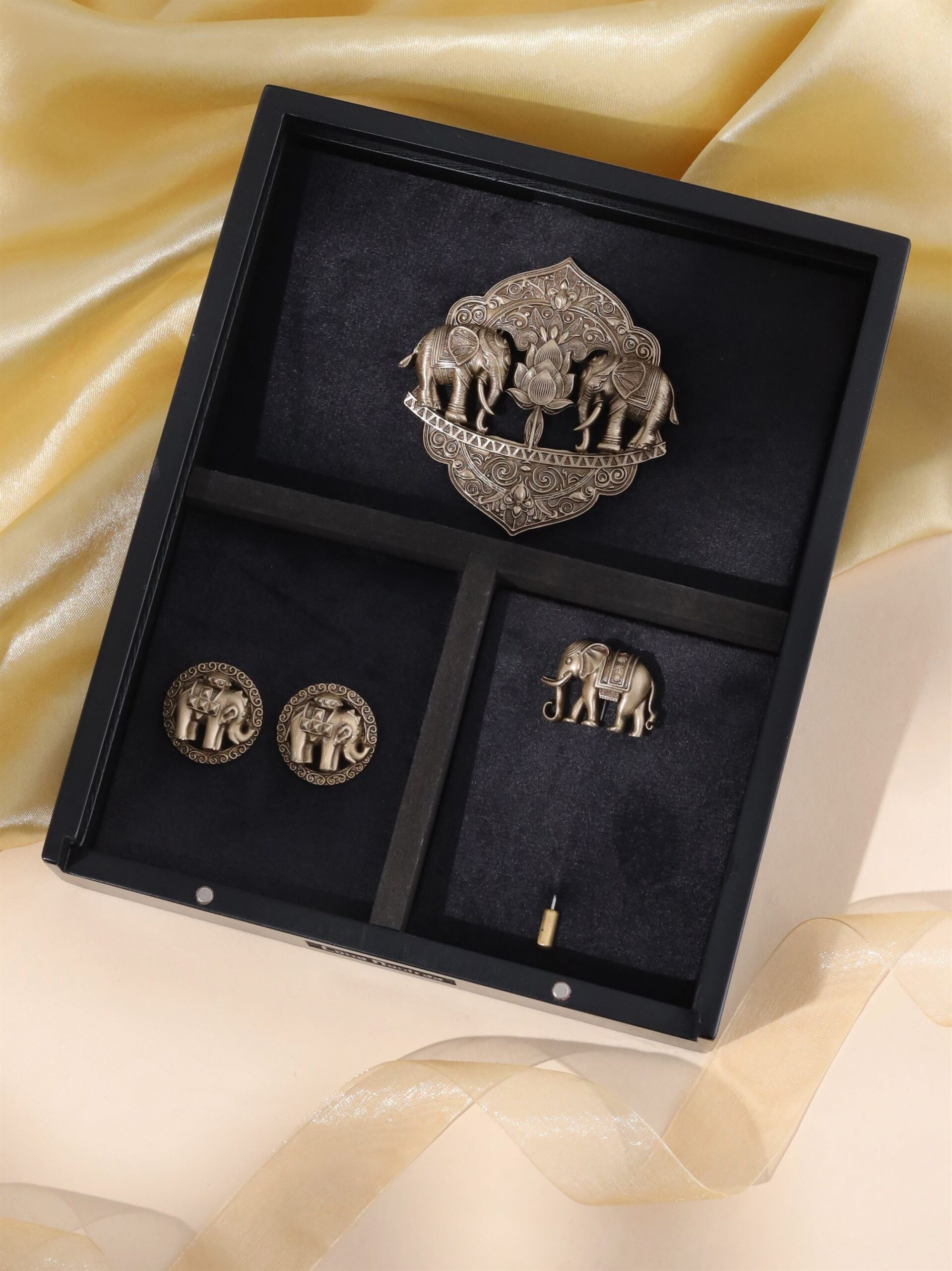 Step into a realm of timeless grandeur with Elephant Citadel ? a gift set inspired by the strength and serenity of royal processions. The intricately carved brooch, paired with a stately elephant lapel pin and matching cufflinks, evokes the rich visual language of heritage and honor. Lightweight and crafted for comfort, this ensemble graces any coat or jacket with quiet power and refined elegance ? a thoughtful gift for those who carry legacy with poise