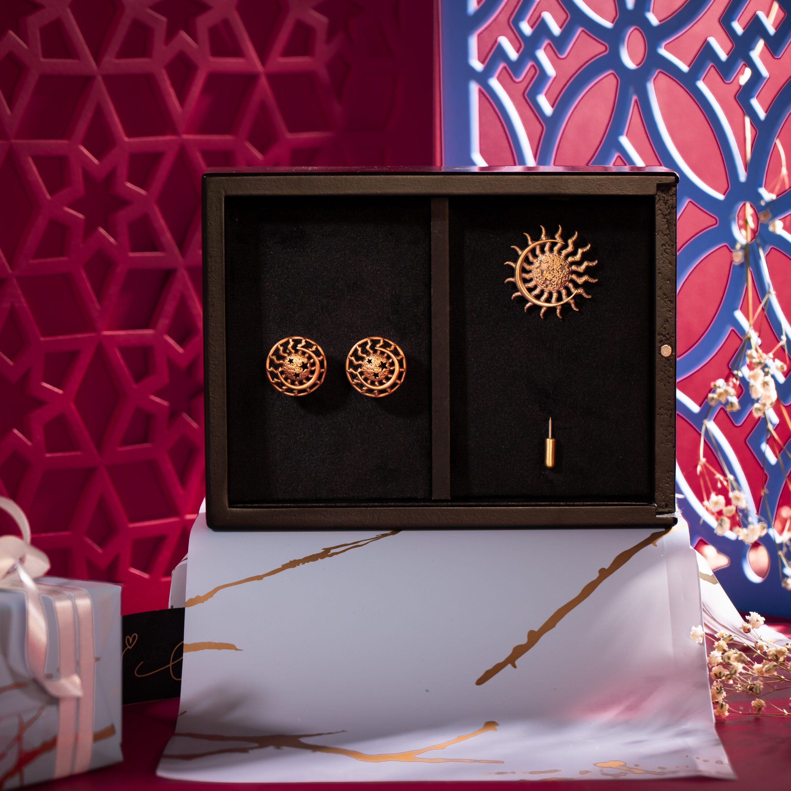 The Lunar Gift Set has the element of moon. The Lapel Pina and Cufflinks are engraved with the moon. Wear this wonder with your Kurta, Suit or Bandhgala and create a lasting impression.