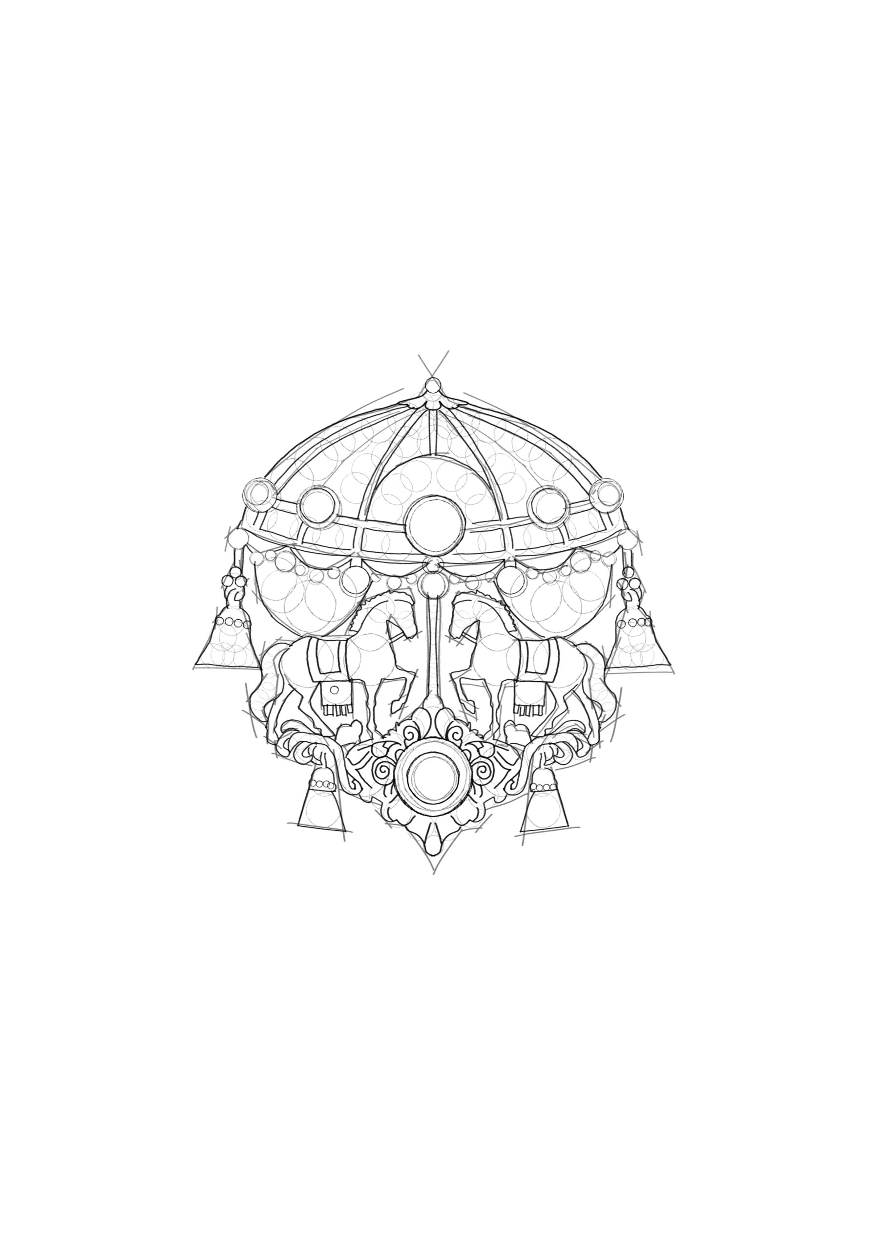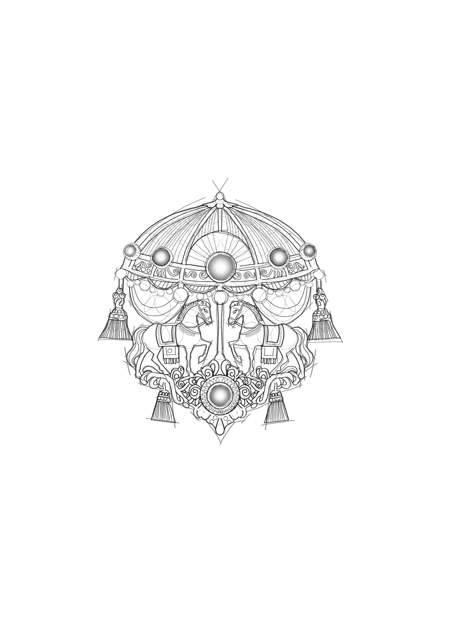The parasol-like canopy, intricately detailed with rich textures and green gemstones, evokes imagery of royal carriages or ceremonial chariots. The draped design and tassels suggest protection, shelter, and high status, traditionally associated with leadership and special occasions. The green stones further add a touch of vibrancy and luxury, enhancing the opulent nature of the design. The overall composition fuses historical elements of regality with a finely crafted aesthetic, making it a timeless statement piece