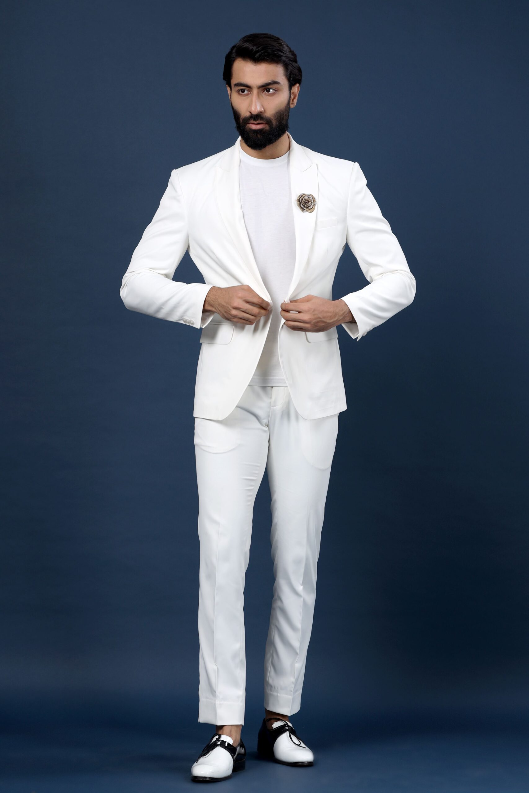 Antonio jacket is a proof of Cosa Nostraa’s dedication to providing the clients with the best quality, timeless fashion apparel. This jacket is an off-white piece of beauty topped with the Regal Rose brooch. The shawl lapel collars of these majestic weaves are something that will add charm to your look.