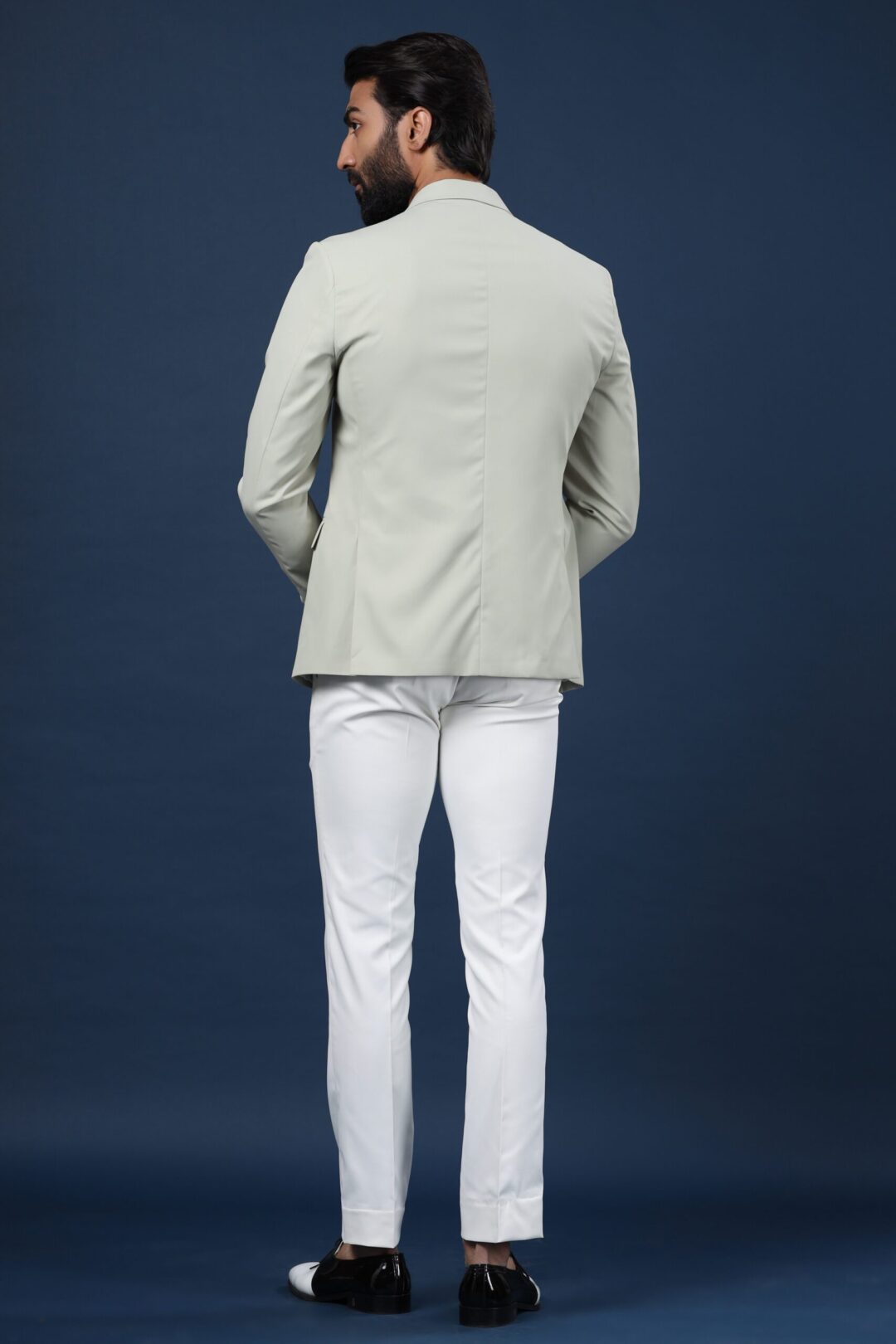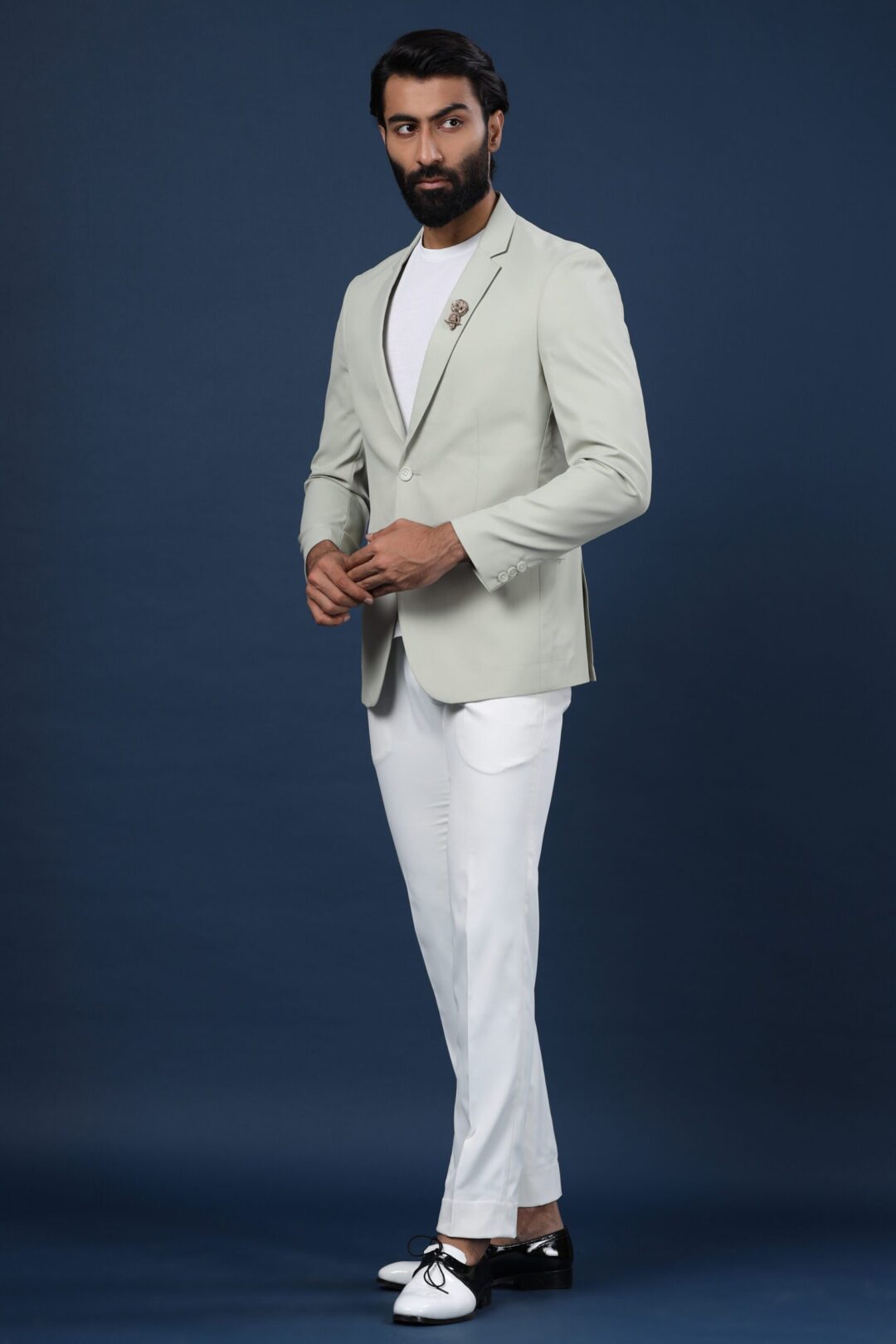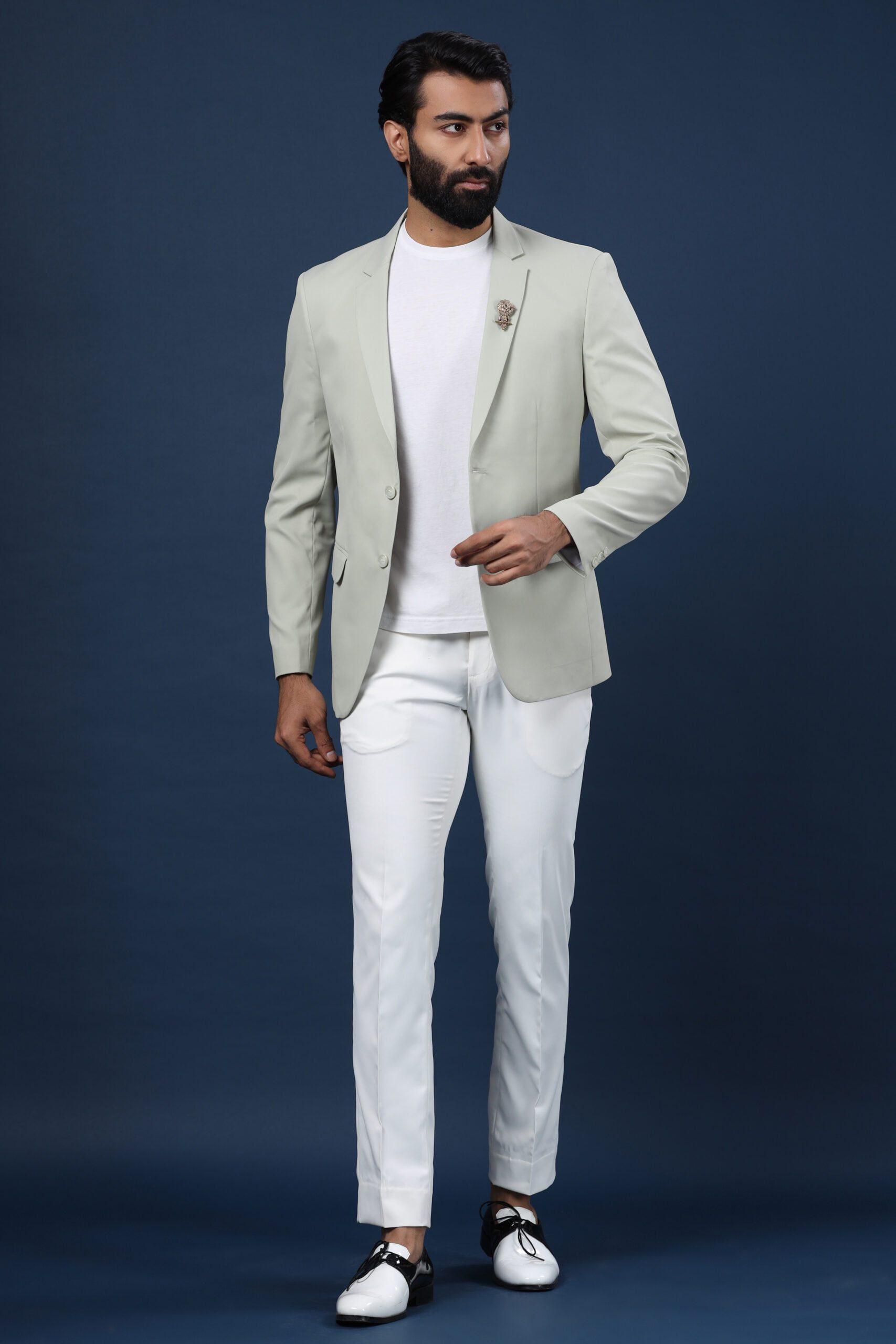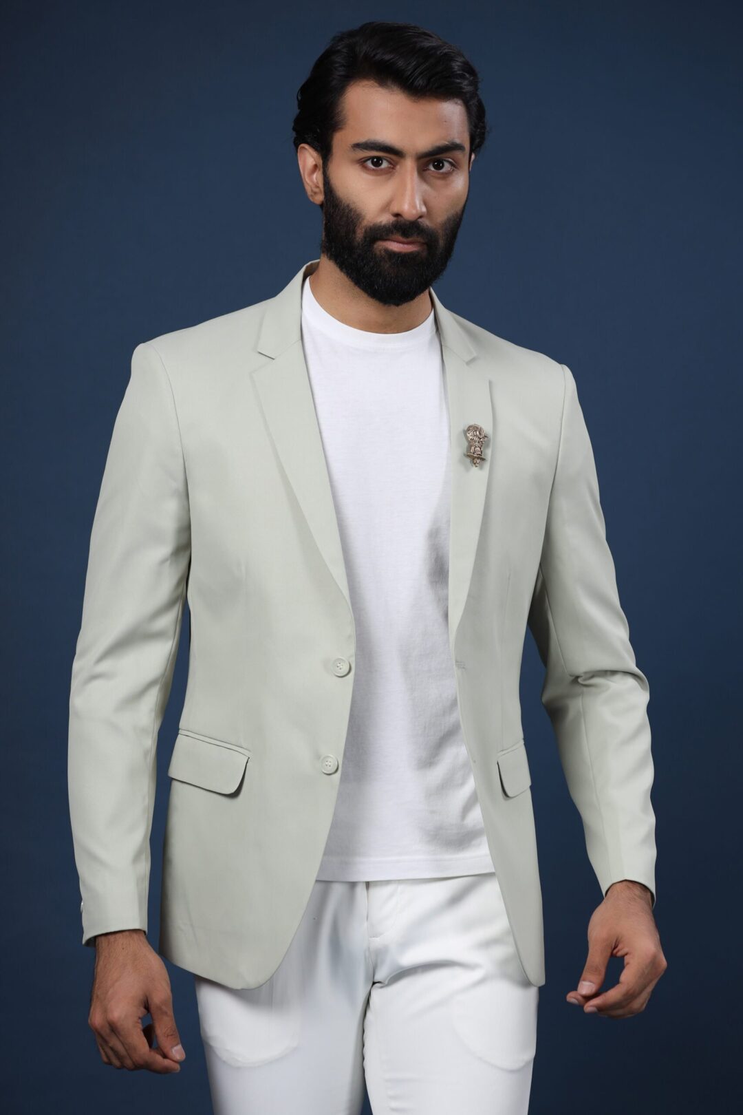 The green-grey Caspian jacket is a style statement apparel. The spread collar and the finishing cut give this jacket a dapper look. When paired with the Hooter brooch, this becomes a must-have occasion wear.