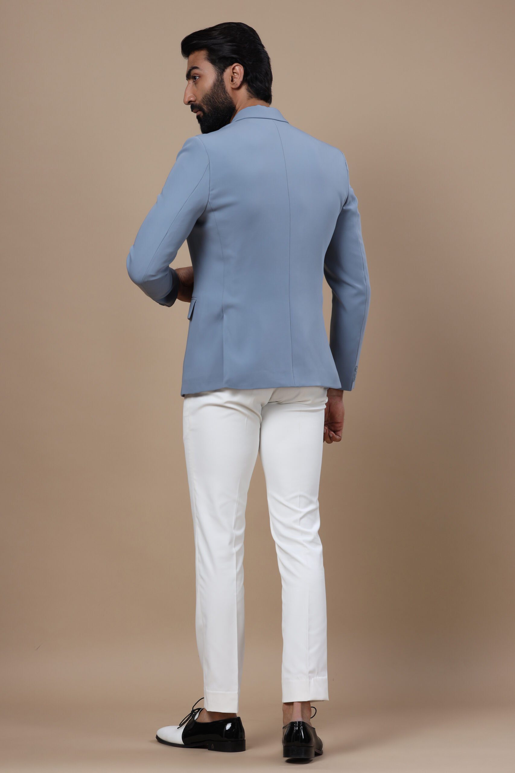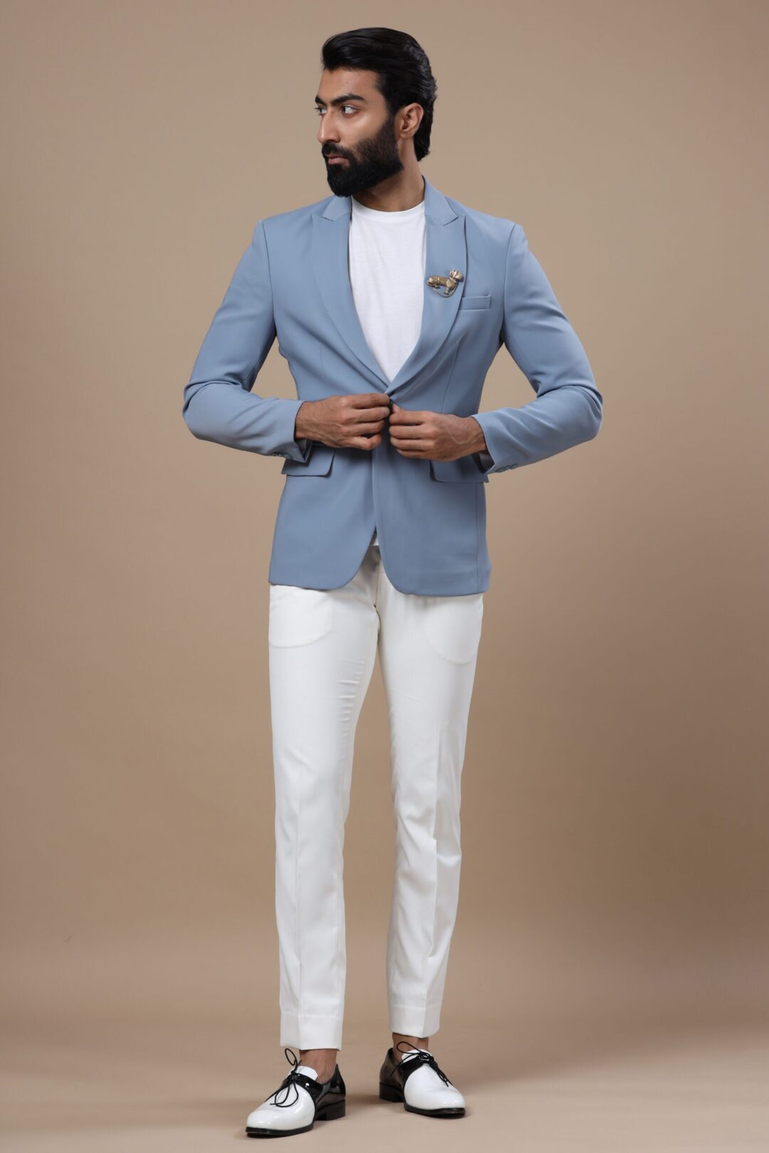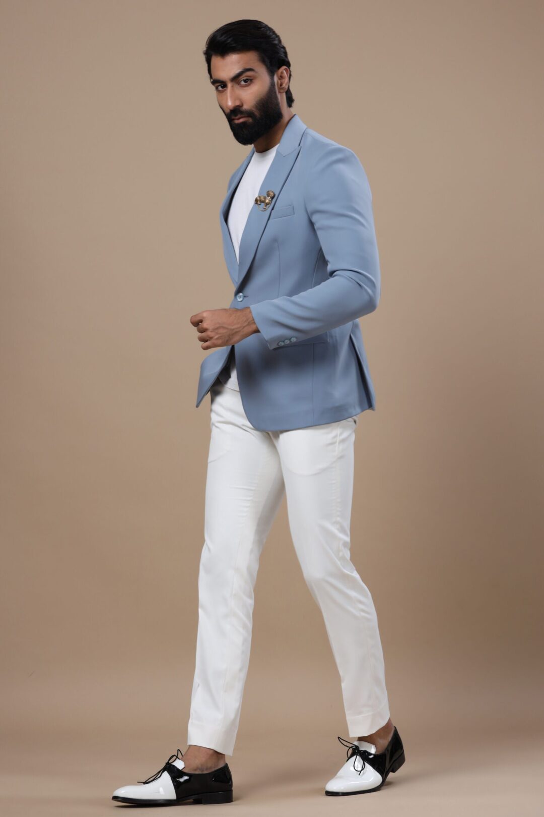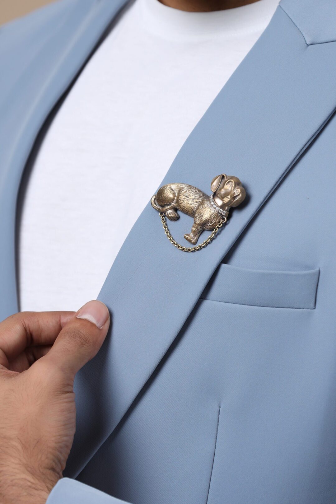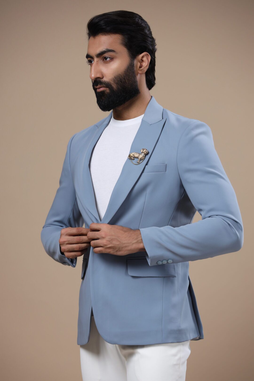 The Mirage jacket is a fine grey-blue jacket stitched with utmost expertise and finesse. This jacket embodies the style and trust that Cosa Nostraa endeavors to deliver to all who choose the brand. Adorned with the Pet Pooch brooch pinned to the peak collars, this jacket makes a stunning attire for all occasions.