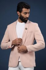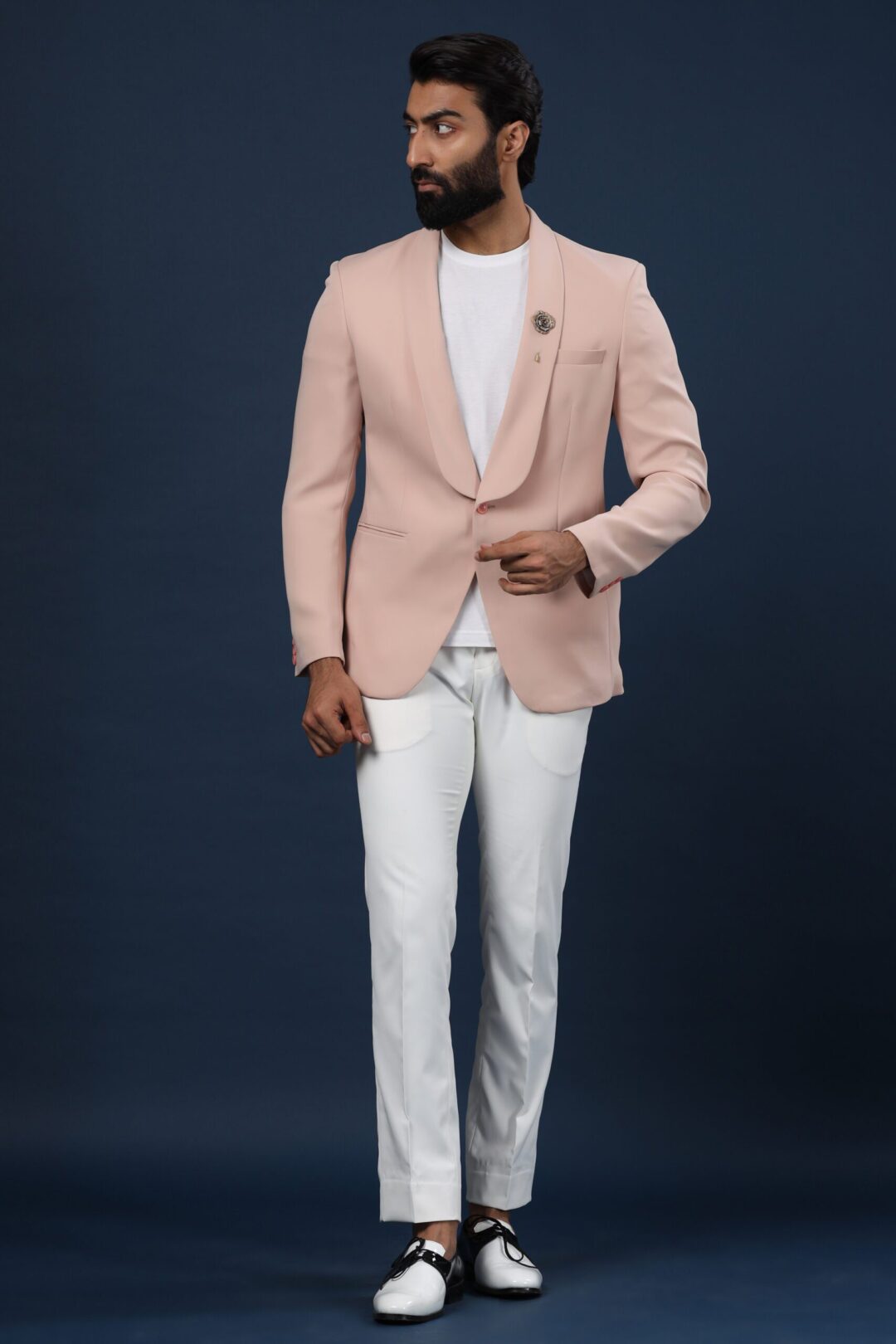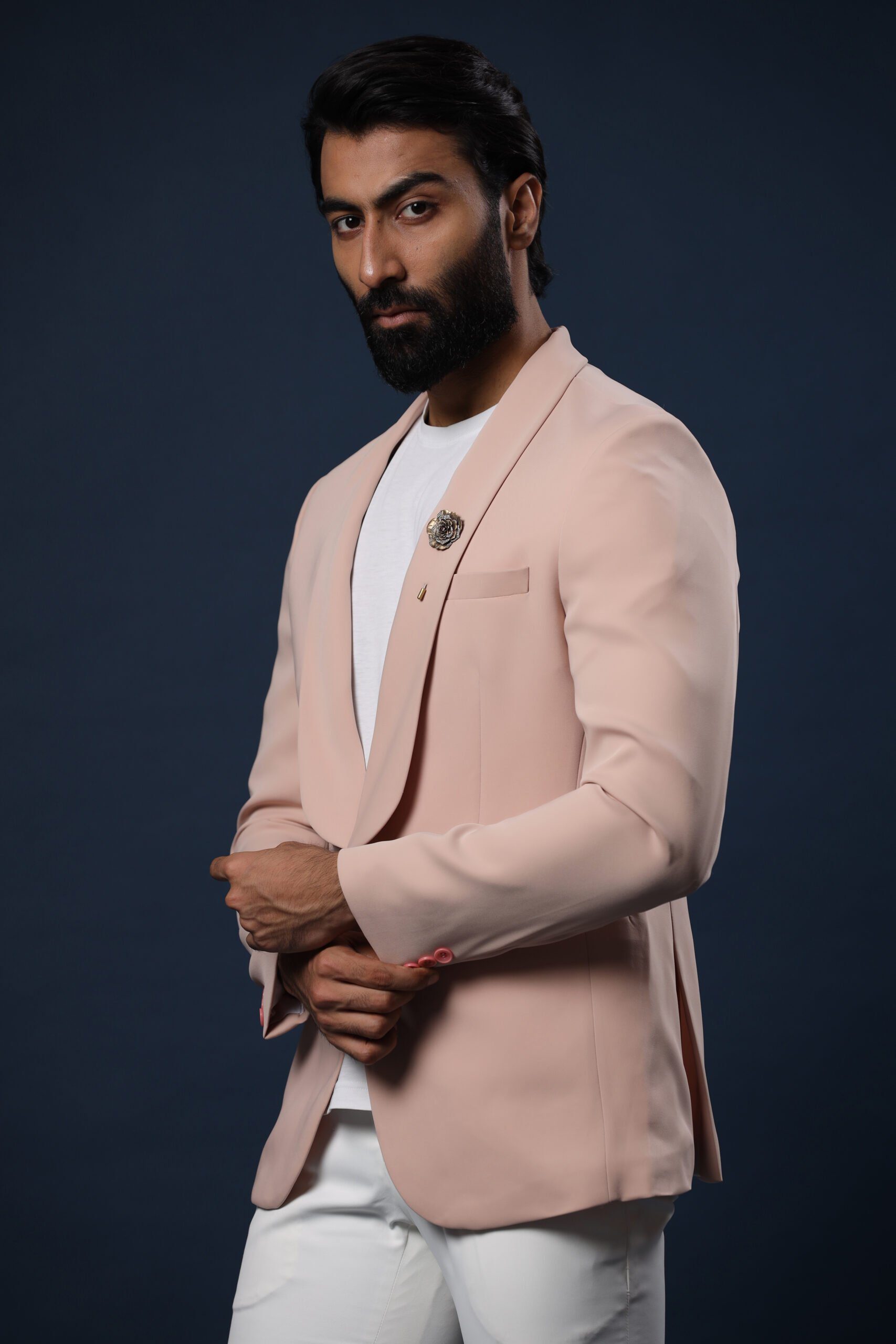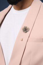 The Philip jacket possessing shawl collars is an example of delicate and perfect craftsmanship. This jacket is a peachish beige-colored apparel that when paired with the Regal Rose lapel pin, gives a charming vibe.