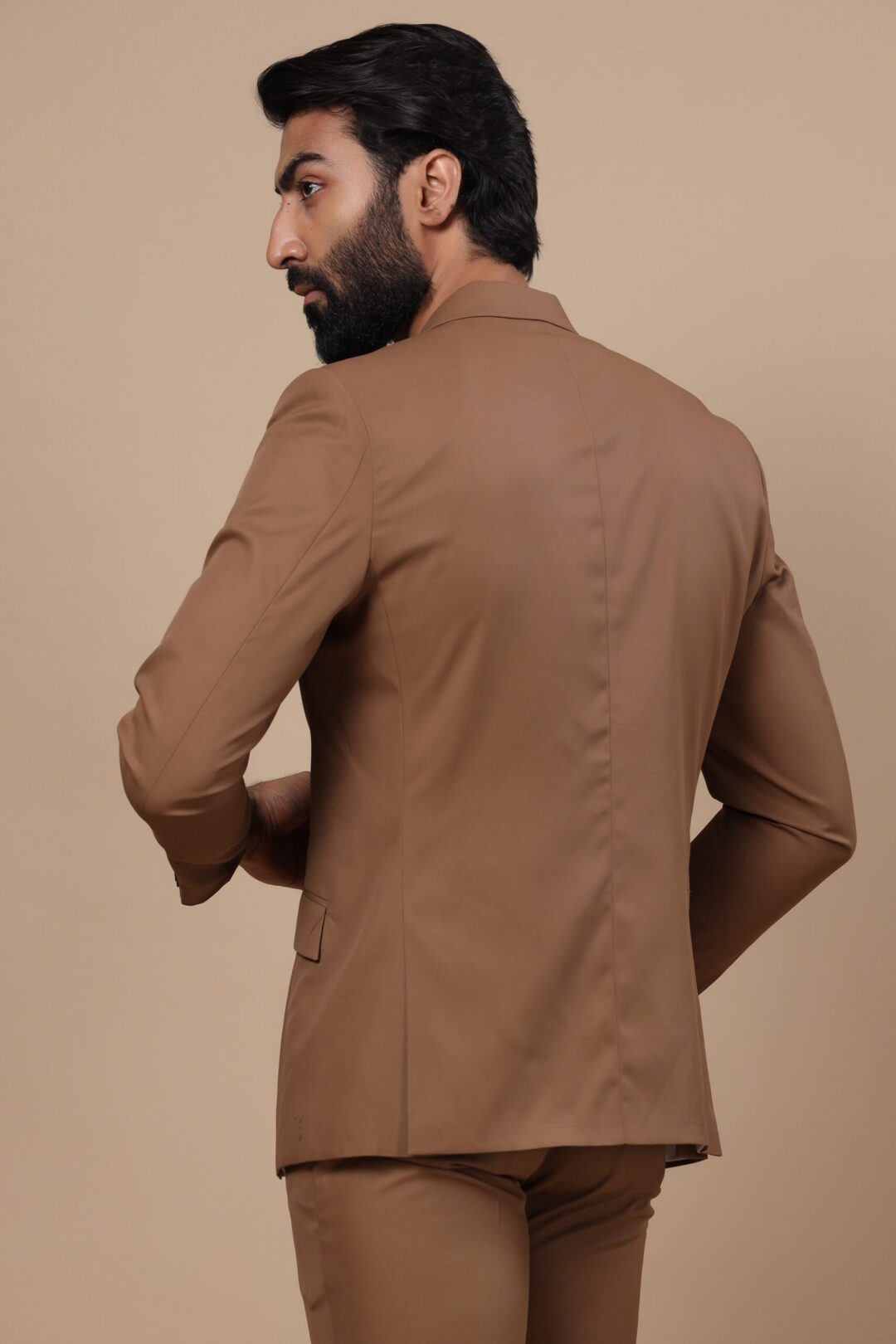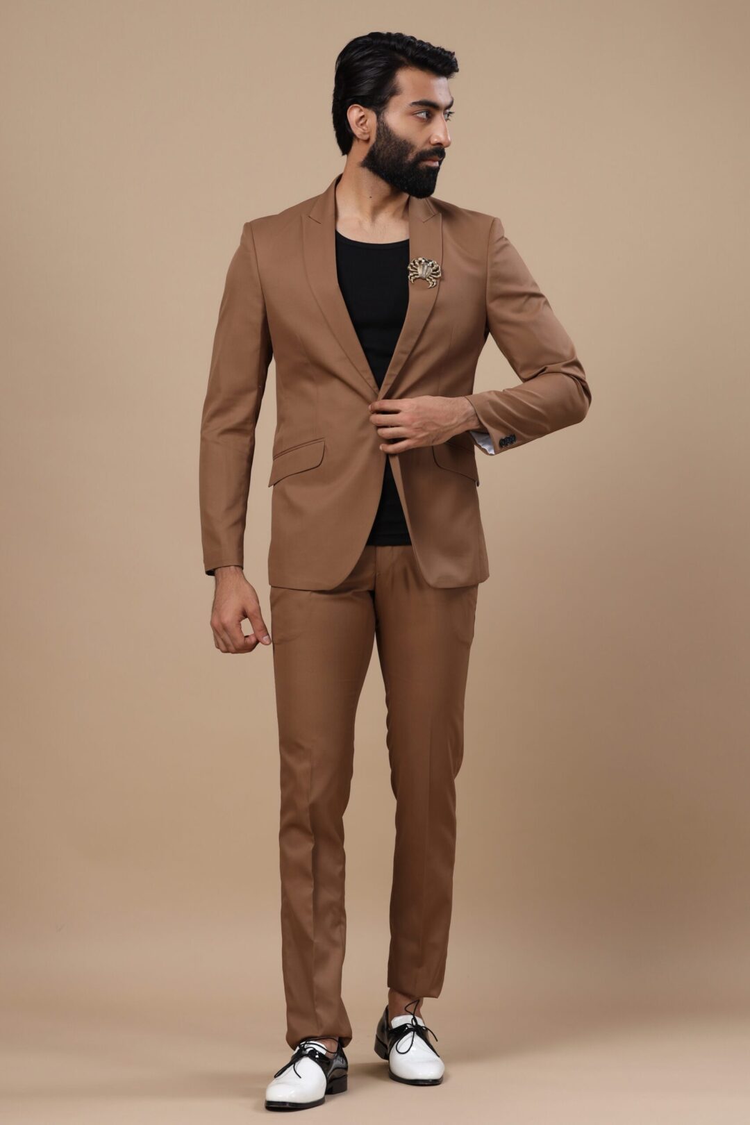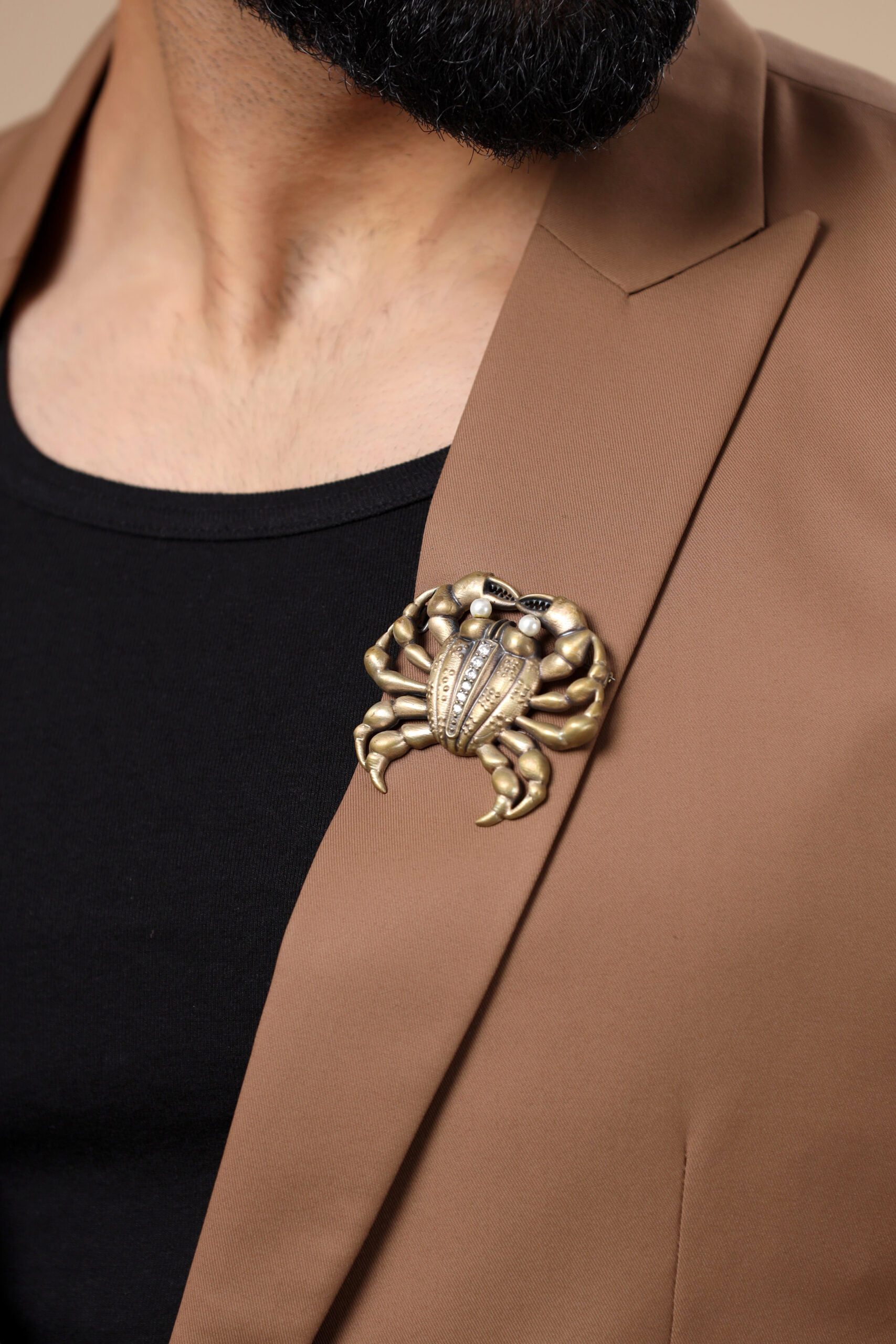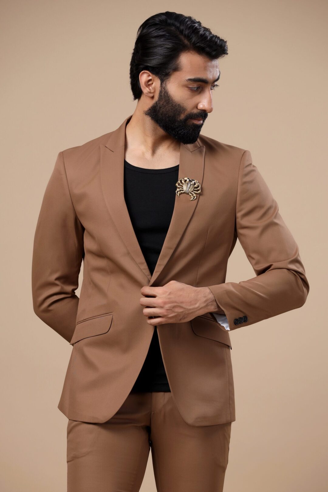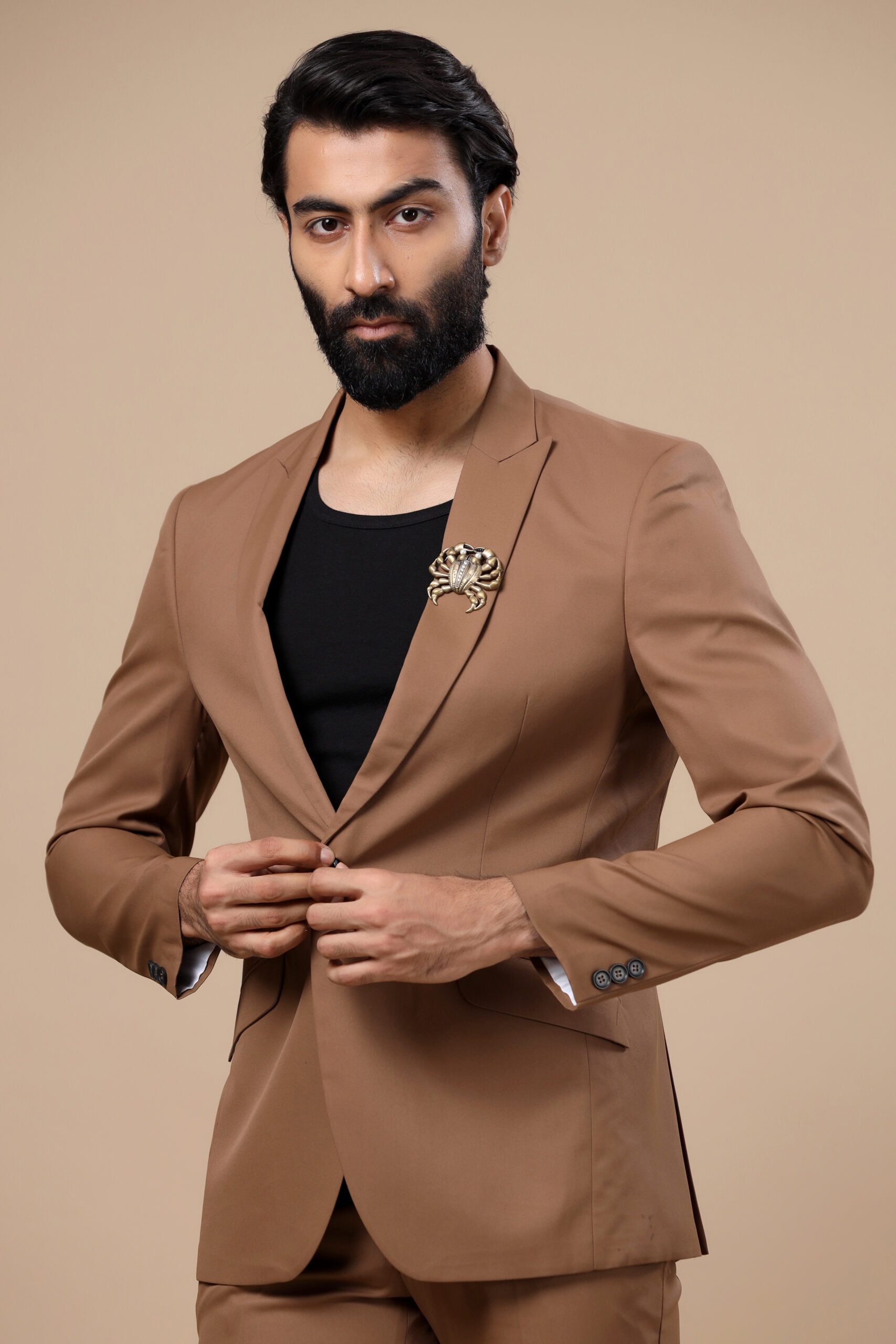 The dark beige Ray jacket is a luxe apparel woven for a perfect gentleman. With our high-end couture, comes our commitment to quality and style. Our designs are sure to make you stand out in the crowd. Ray jacket when bejeweled with the Jeweled Crab brooch pinned to peak collars, it will surely enchant your vibes.