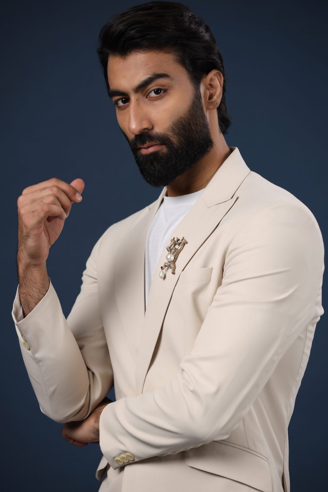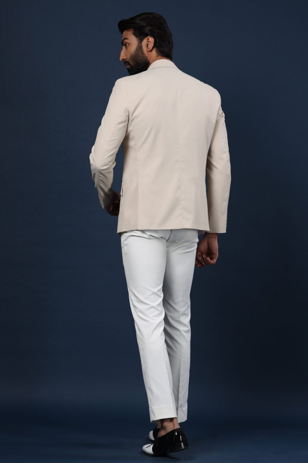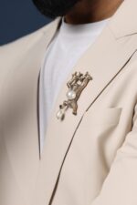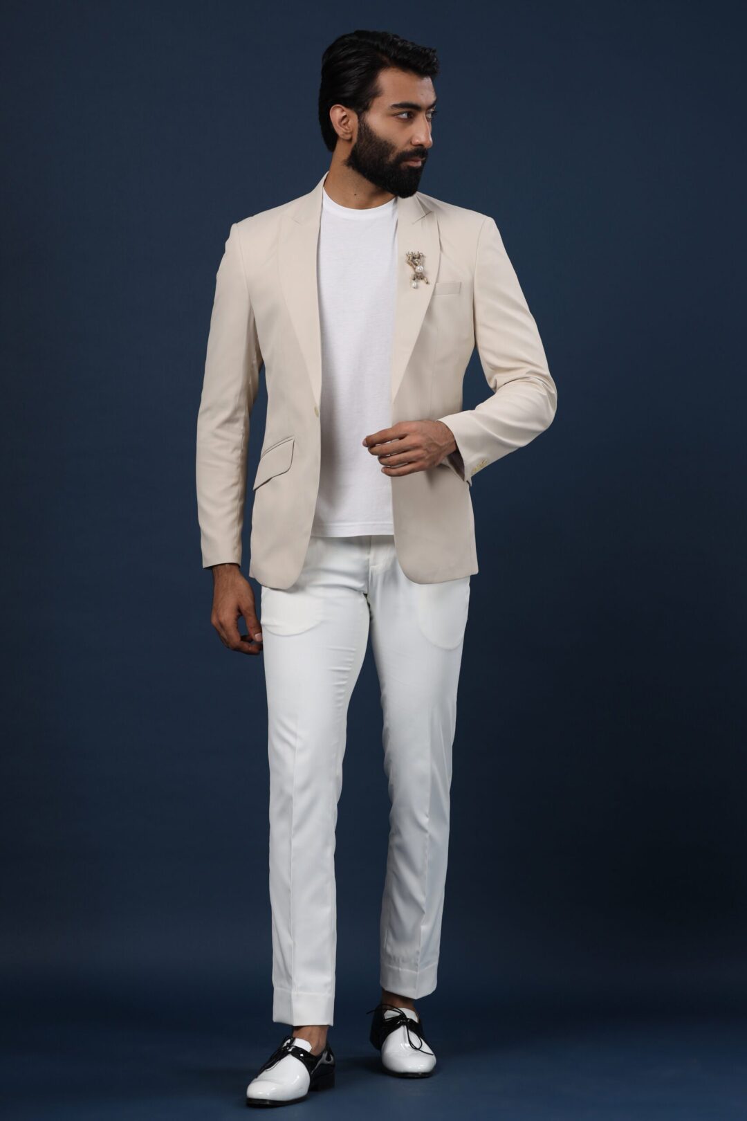 Painted with the lightest shade of beige, the Roy jacket is one of the must-have apparels that can be donned at a party. The fancy jacket topped with a peak collar is sure to add glory to anyone who wears it when topped with the Pearl Monkey brooch.