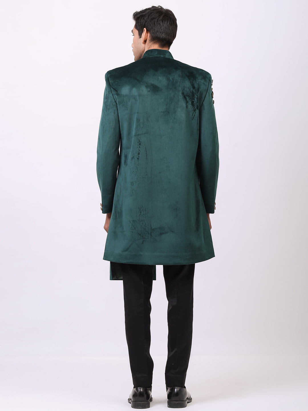 Woven with threads of precision and style, the Cosa Nostraa bandhgala with tilted hem becomes the ultimate party wear. Made of high-quality velvet, this bandhgala defines the shine that your personality emits are you enter a room!