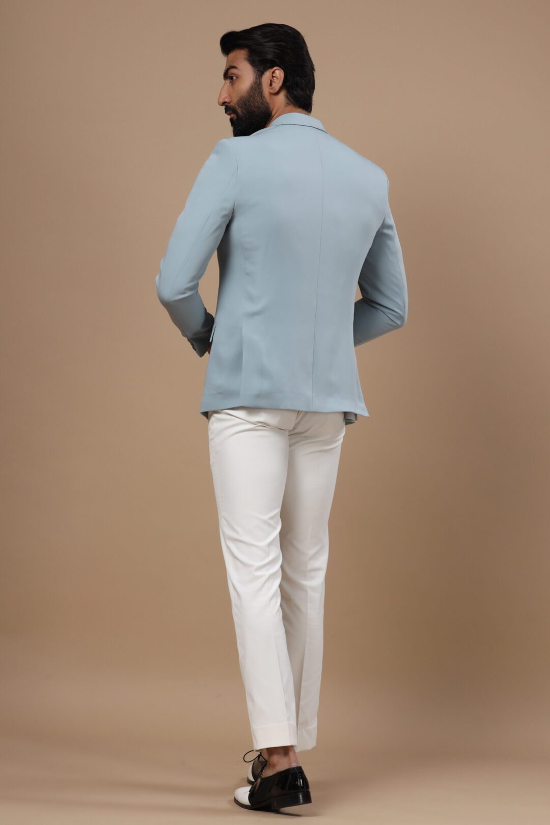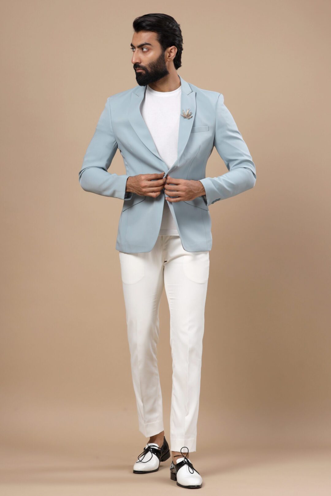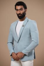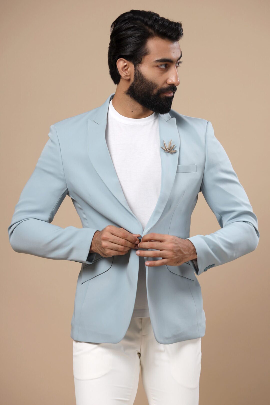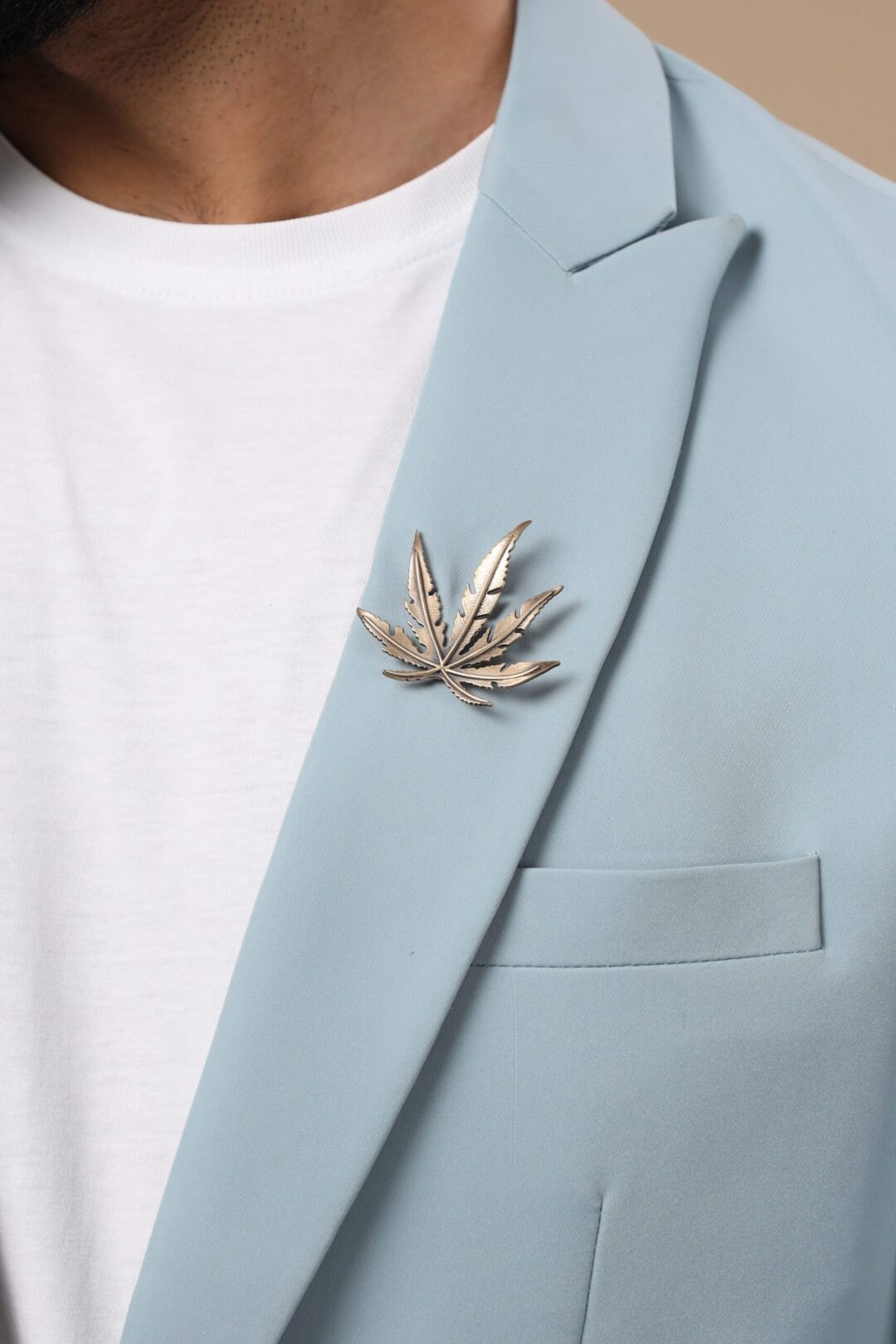 The light teal Truman jacket is a state of art fashion apparel designed with pride and perfection. This is an apparel that can be donned at any function. The mesmerizing notched lapel collar style makes this an apt wear. When paired with the Majestic Maple brooch, this becomes a must-have piece of art.