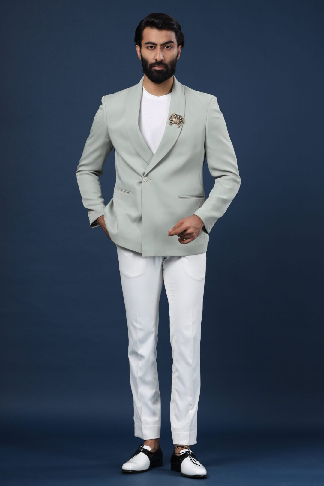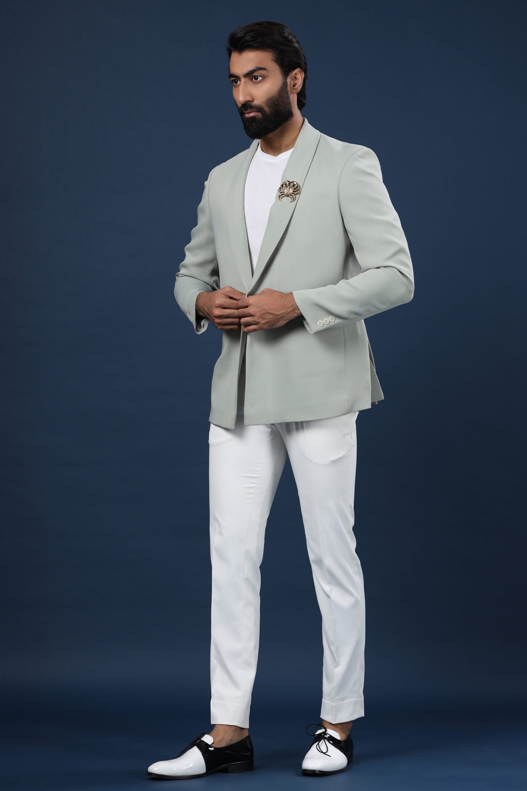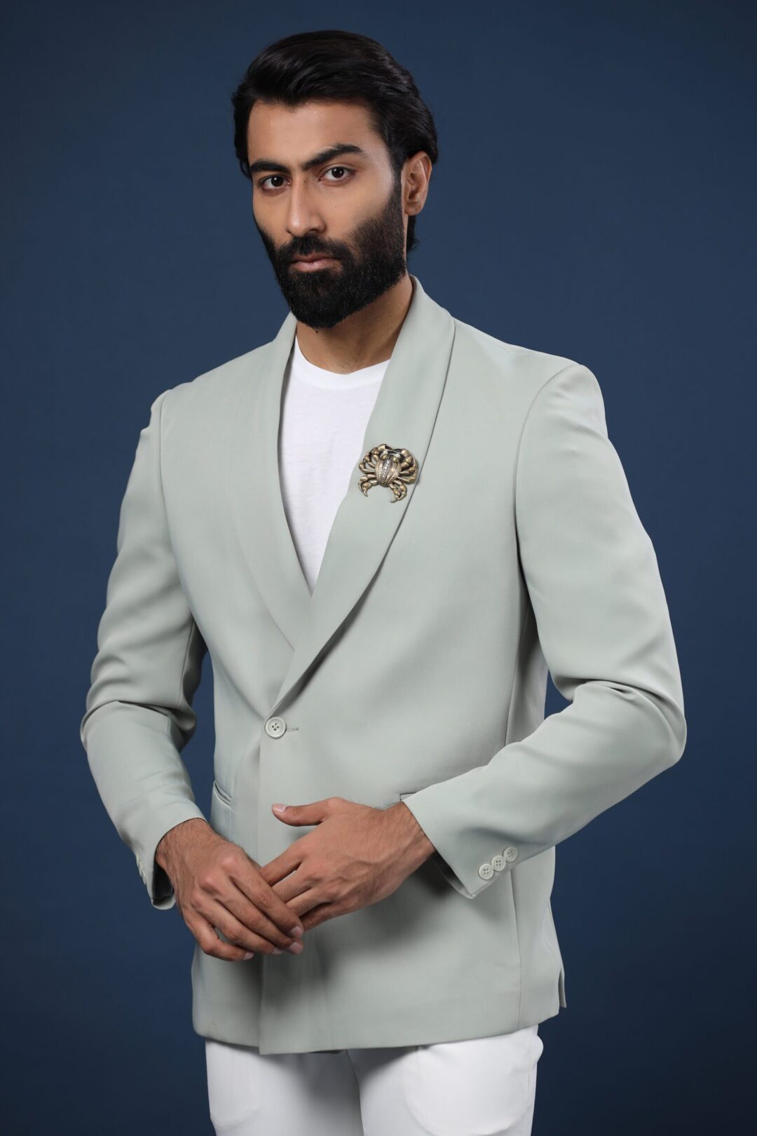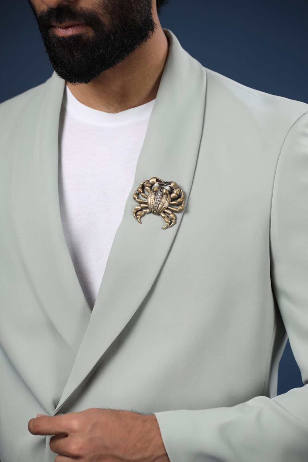 Made of the Japanese Teijen material, the Tuscan Ivory jacket is emblematic of lasting comfort. The precise stitch redefines the fashion statement-making it is an elegant outfit to possess. This apparel is an apt combination of luxury and comfort. With the Jewelled Crab brooch pinned to the collar, this apparel becomes something to set the heart on.