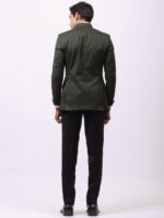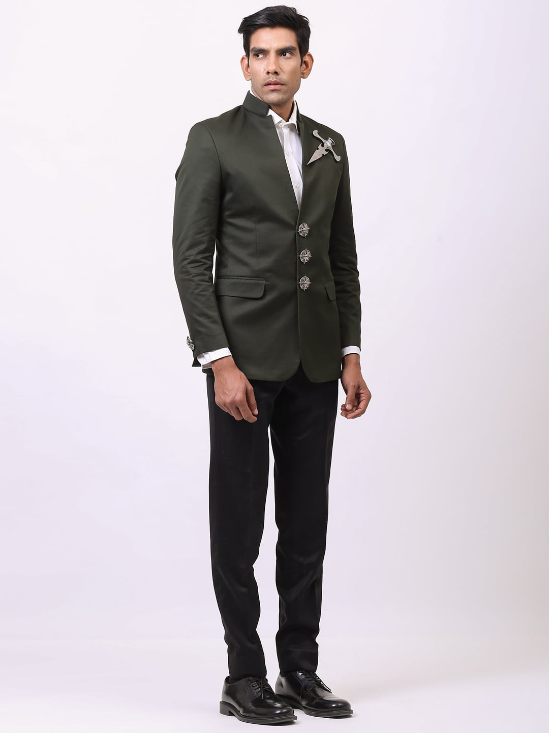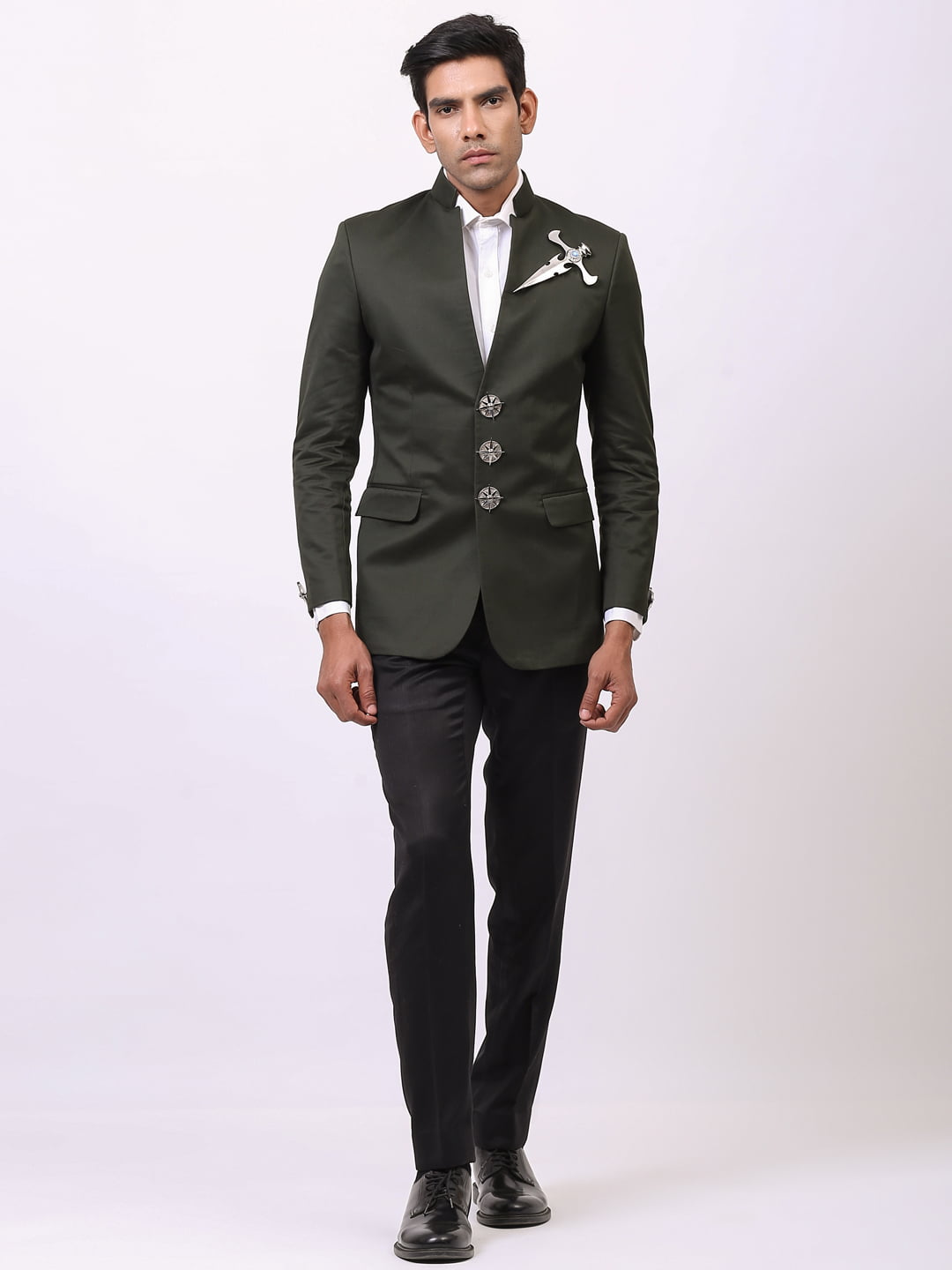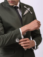Valor is an olive green blazer curated with luxurious high-quality cotton. The blazer redefines the statement look by becoming one-of-a-kind apparel. Styled with a notched band collar and dapper buttons and patch pocket, this blazer is sure to suit all occasions. The dagger brooch attached adds magic to the attire.