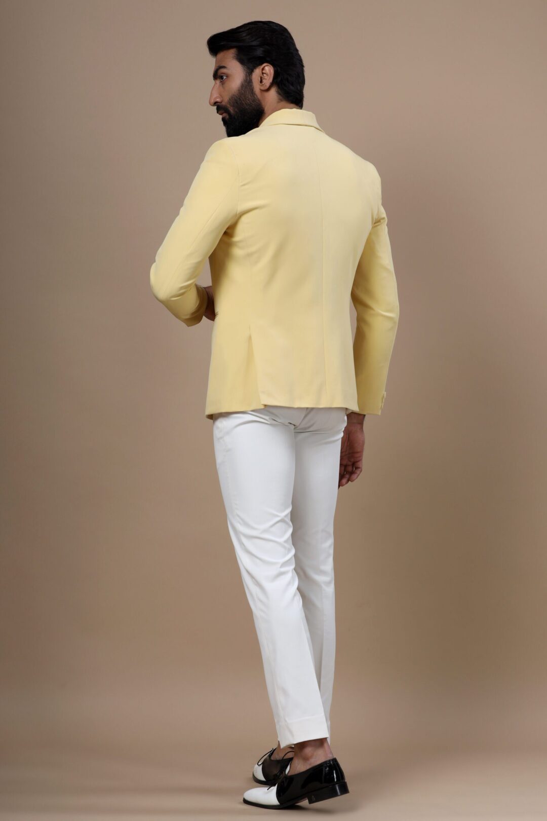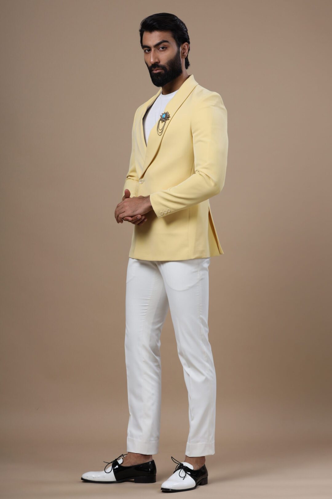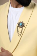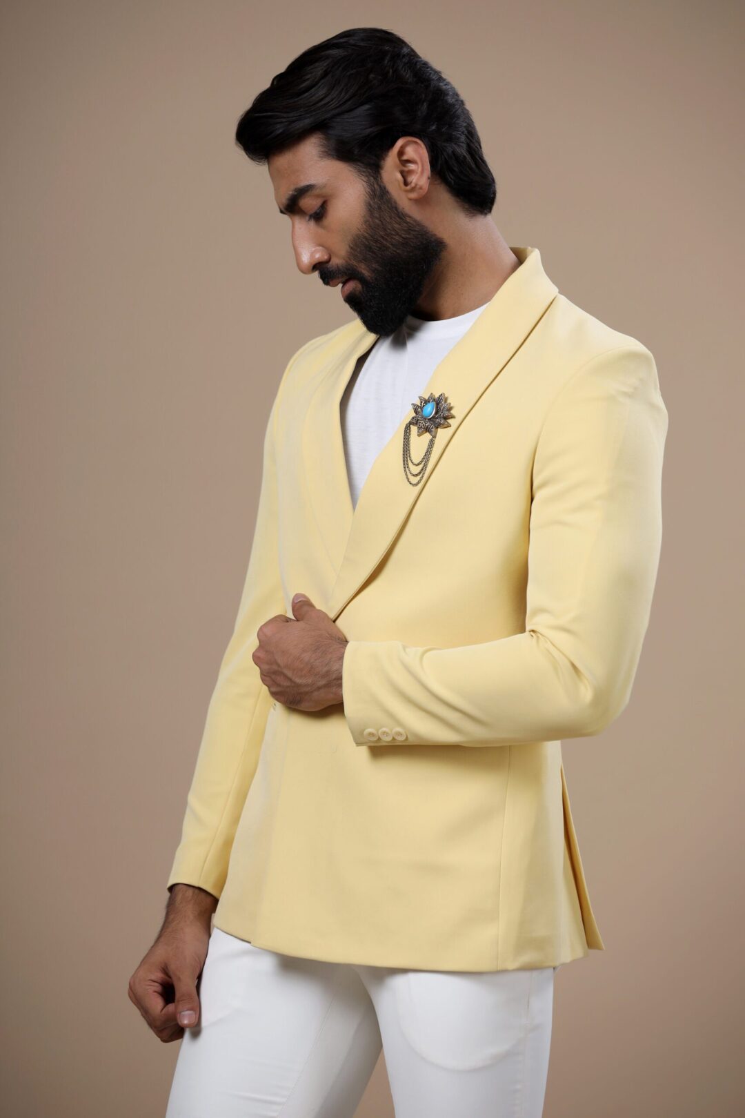 Zenith jacket is designed by Cosa Nostraa to depict a manīŋŊs courage. It is an ombre yellow, exuberant piece of fashion apparel. The shawl lapel collars are styled with the Slytherin brooch, which allows the wearer to ooze enchanting vibes.