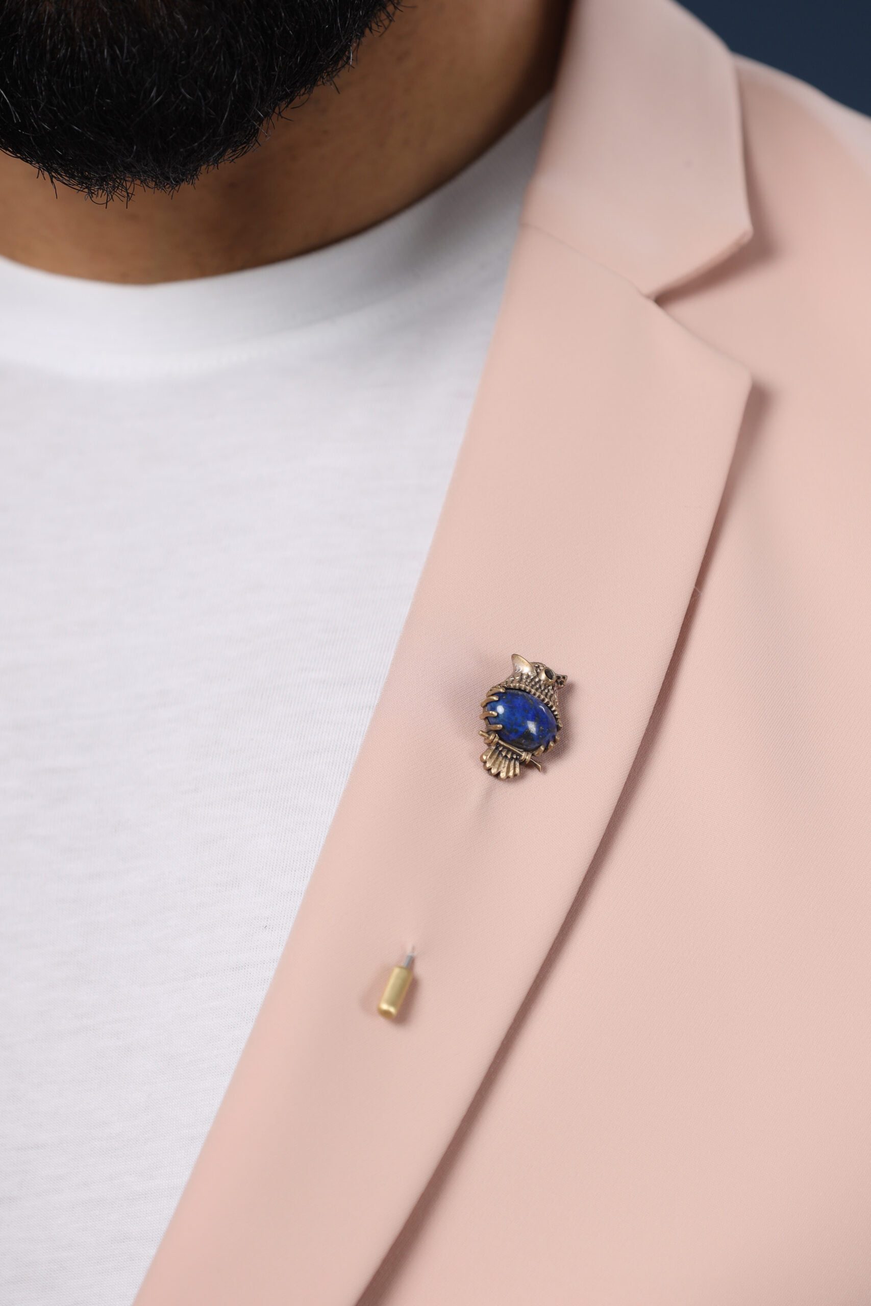 The Blue Owlet Lapel pin is one of a kind design. The delicate carving of an owlet that is fixated with a cobalt blue stone gives this lapel pin an enchanting vibe. The tail feathers have been delicately carved with precision and the detailing of the eyes is uber enticing.