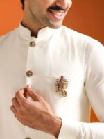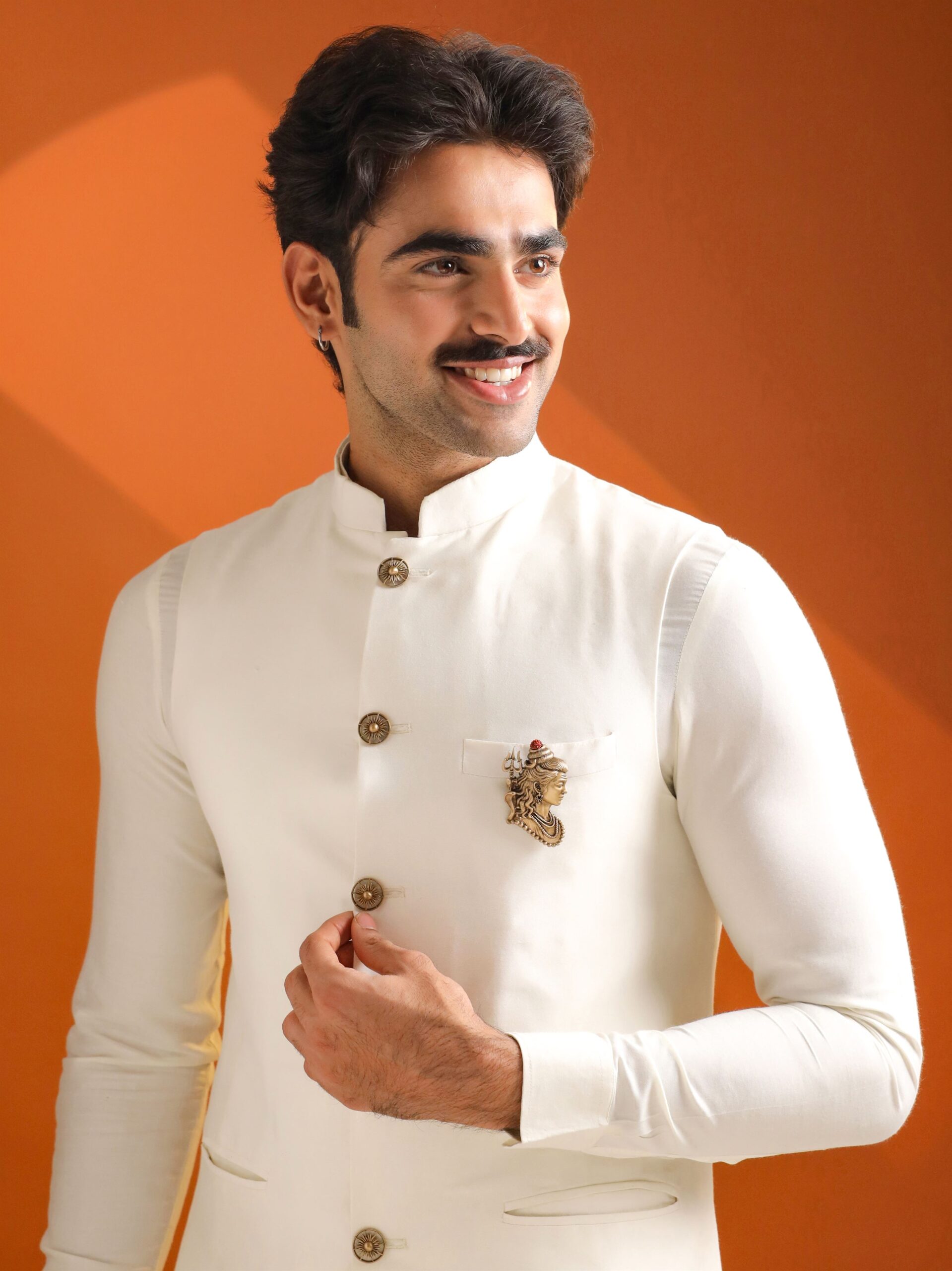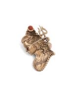 A refined men?s brooch inspired by Lord Shiva?s serene profile, symbolizing calm strength and spiritual power. Crafted in antique gold tones with detailed hair texture, trishul and serpent accents, and a Rudraksha highlight, it adds timeless elegance to sherwani, bandh gala, and fusion attire.