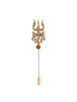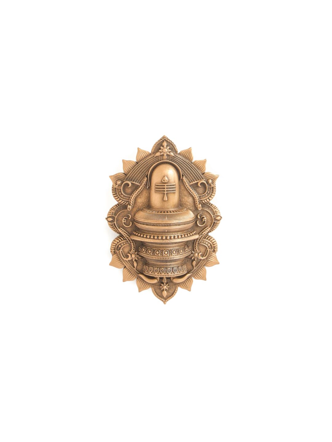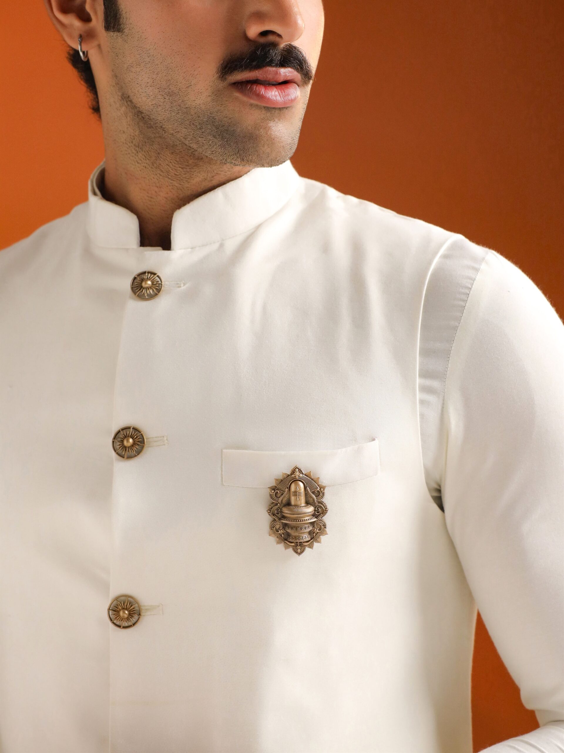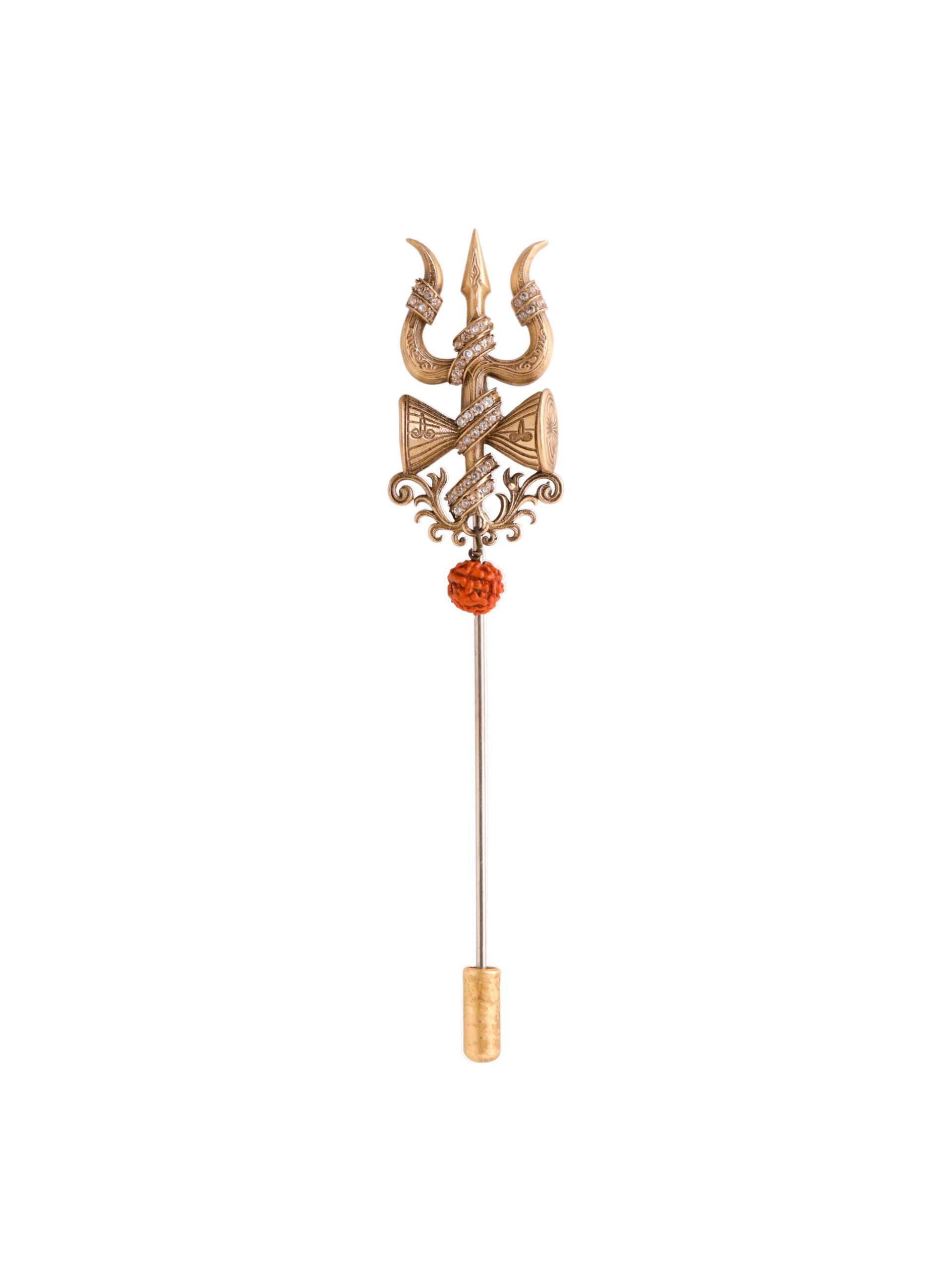 Crafted in antique gold finished metal, the brooch highlights a sacred Shivling framed with detailed carvings, while the lapel pin carries a Trishul and Damru motif accented with Rudraksha.