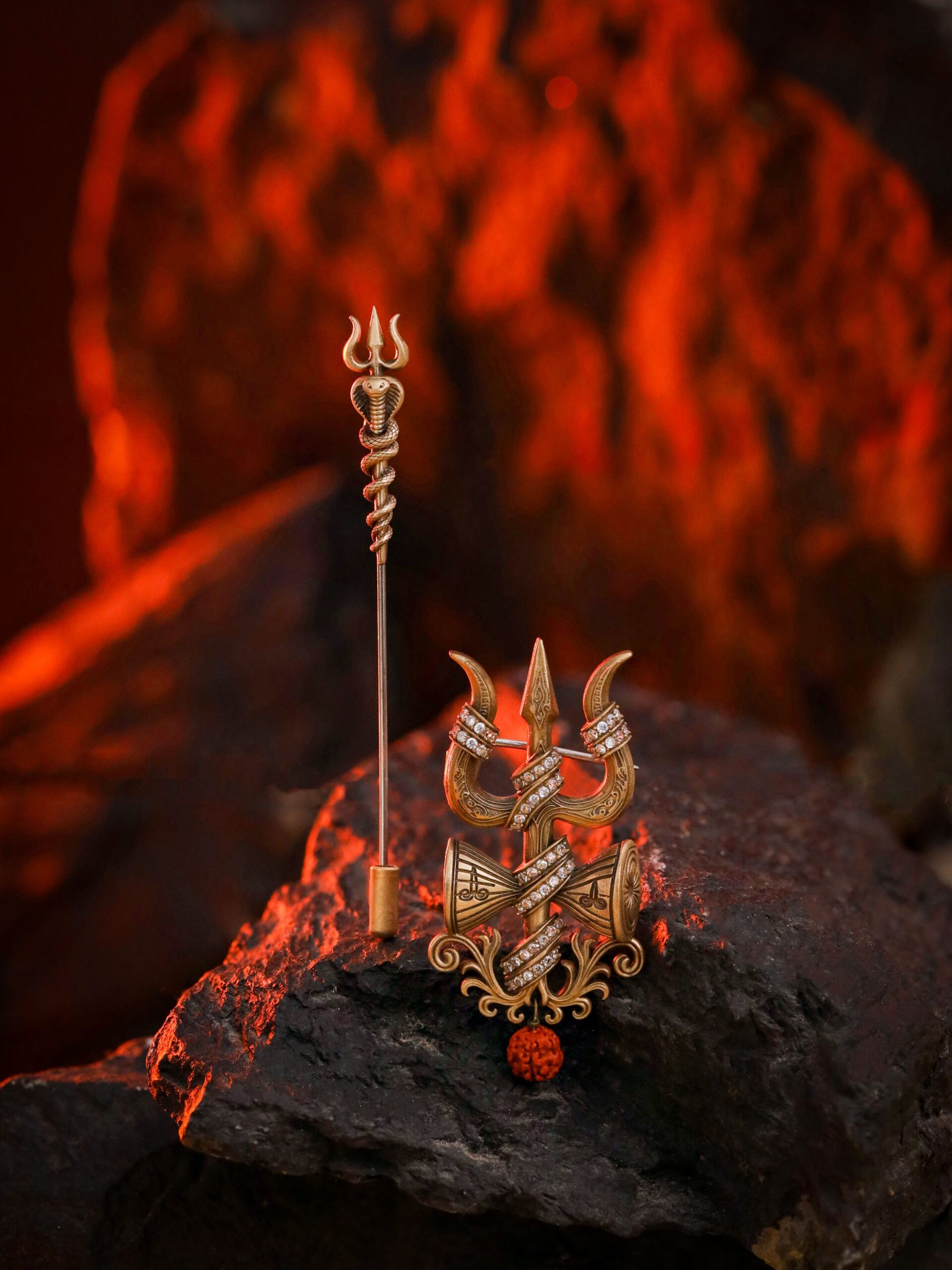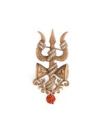 Crafted in antique gold finished metal, the brooch highlights the sacred Trishul and Damru with subtle stone detailing and a Rudraksha accent, while the lapel pin carries a serpent-wrapped Trishul motif.