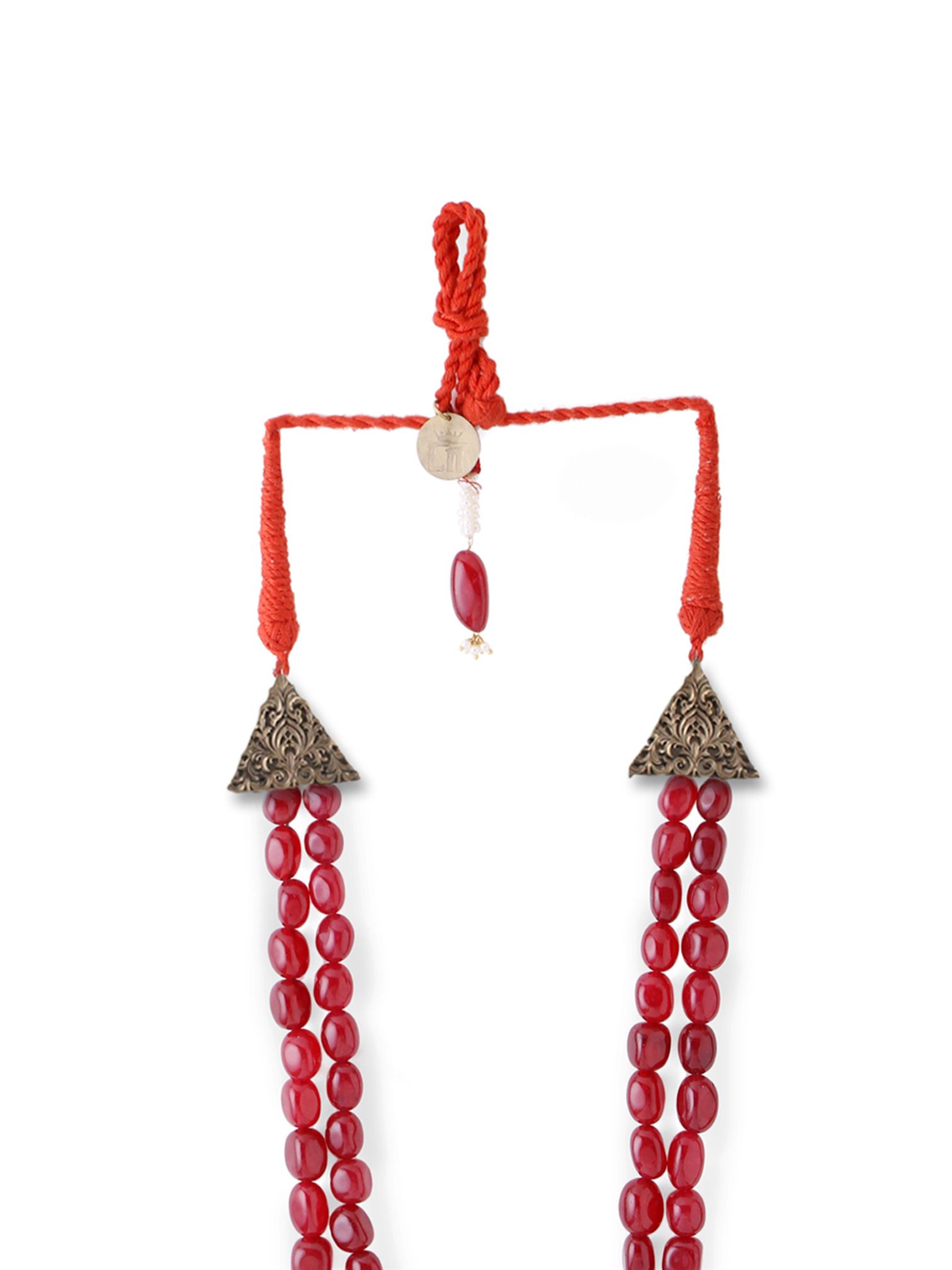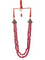 A stylish piece with red coloured double chains that beautifully cross and interlink, producing a traditional knot detail. This look is ideal for dressing up a conventional outfit since it strikes a balance between elegance and beauty. The stunning red stones increase its charm making it perfect for any special occasion.