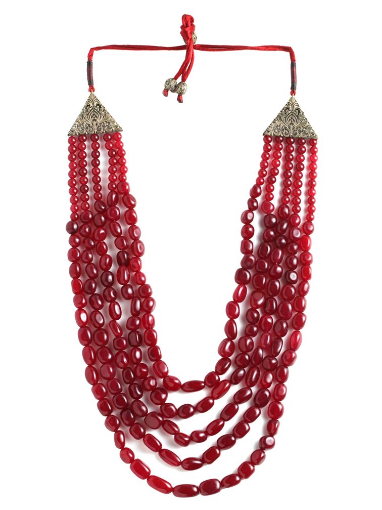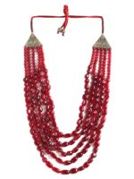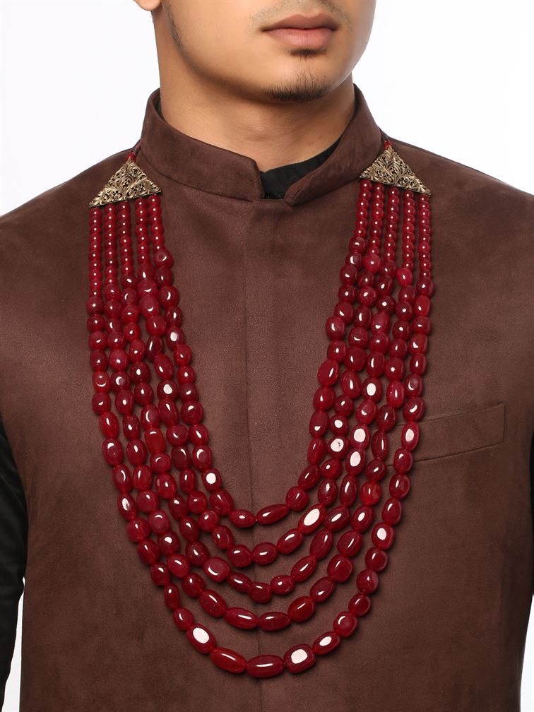 Presenting the Red Pearl Mala, a unique accessory for men studded with five layers of glass pearls in red colour. This avant-garde Red Pearl Mala is here to quirk up your wardrobe. Wear it on a block-printed shirt or a monochrome jacket to exude those playful vibes!