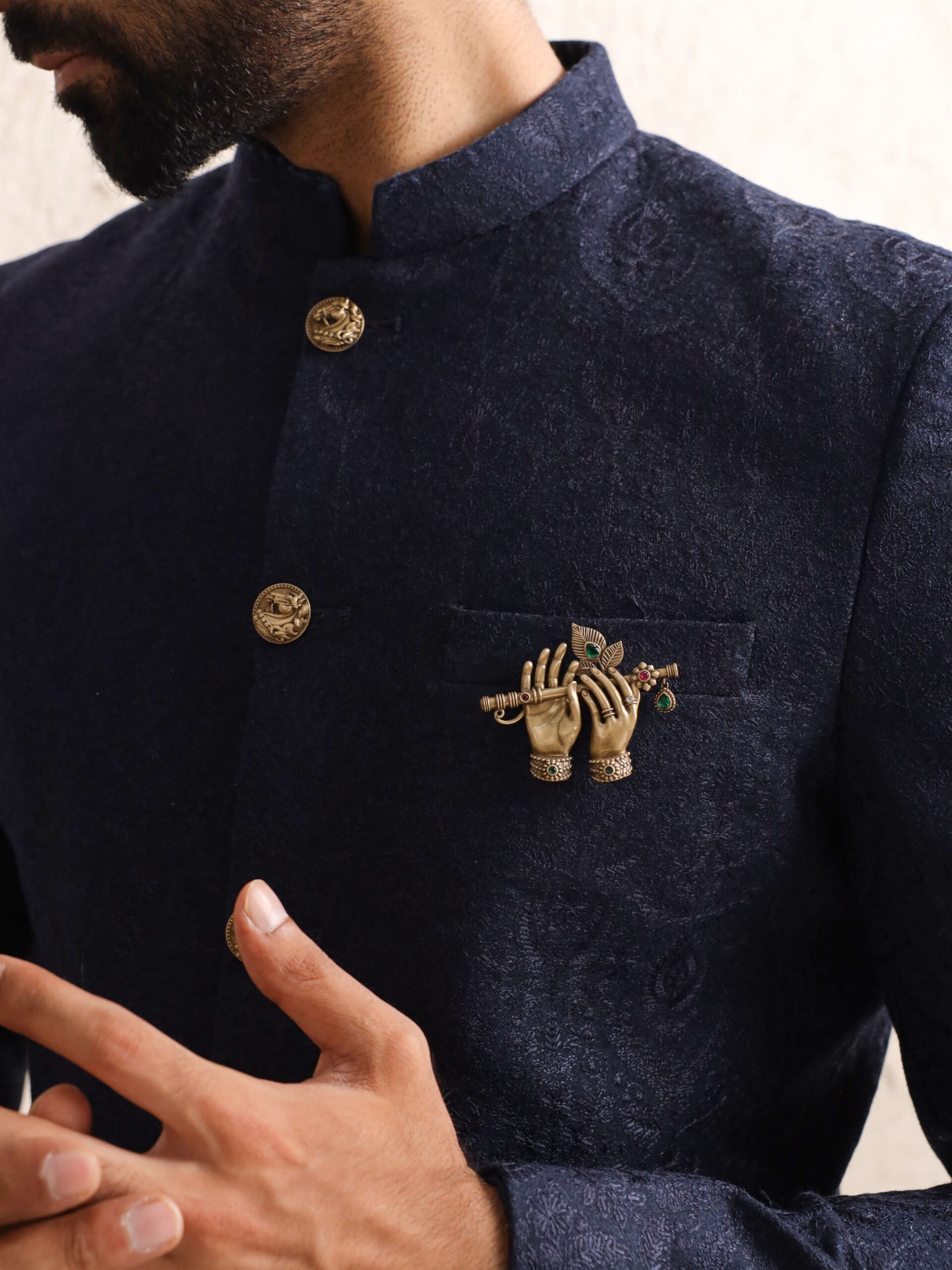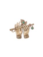 This brooch beautifully depicts graceful hands holding Lord Krishna?s flute, symbolizing divinity, love, and harmony.Crafted in antique gold with green and red stone accents, it blends spiritual artistry with timeless elegance.