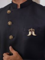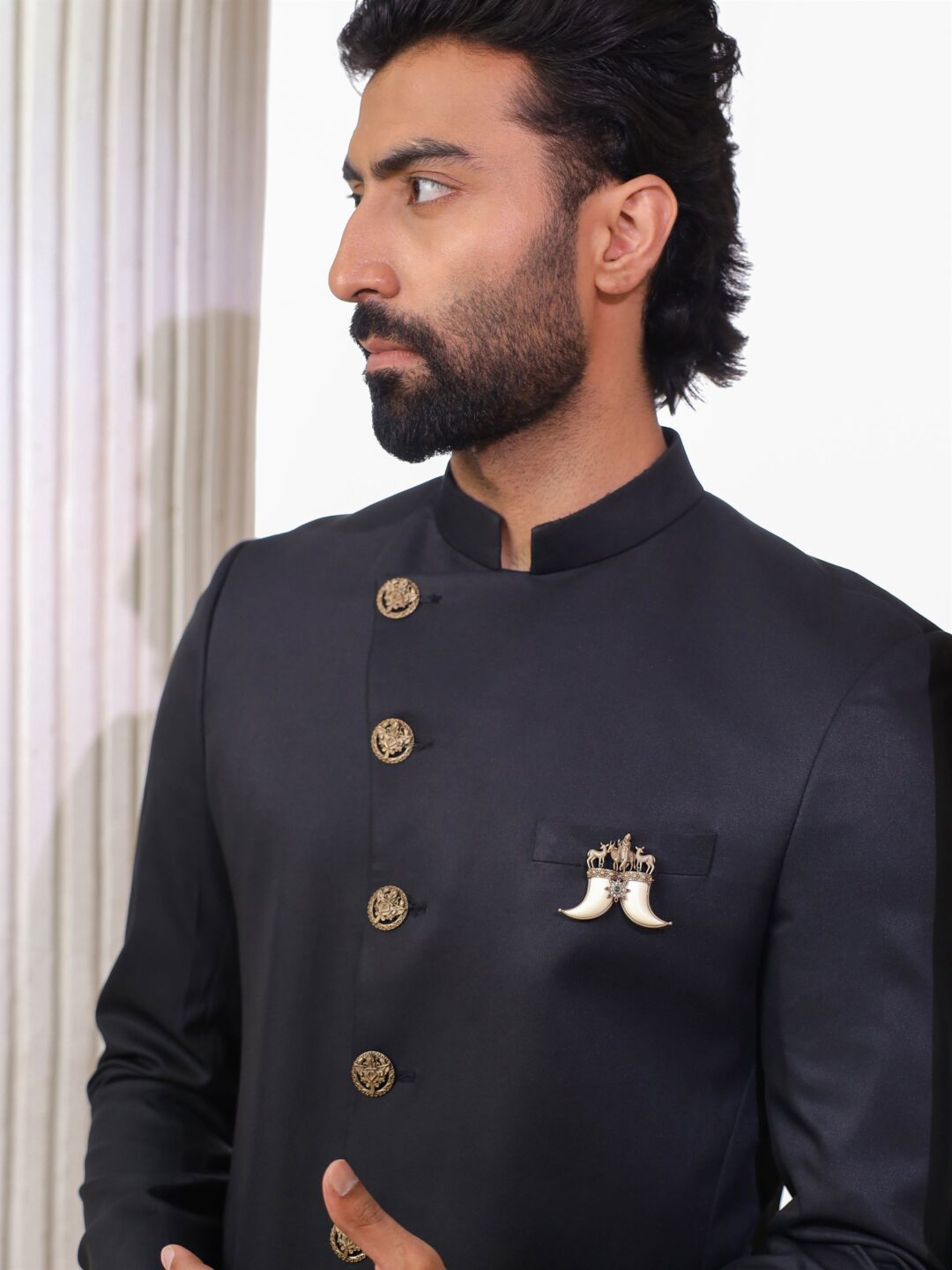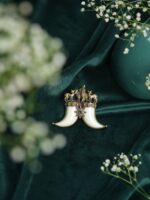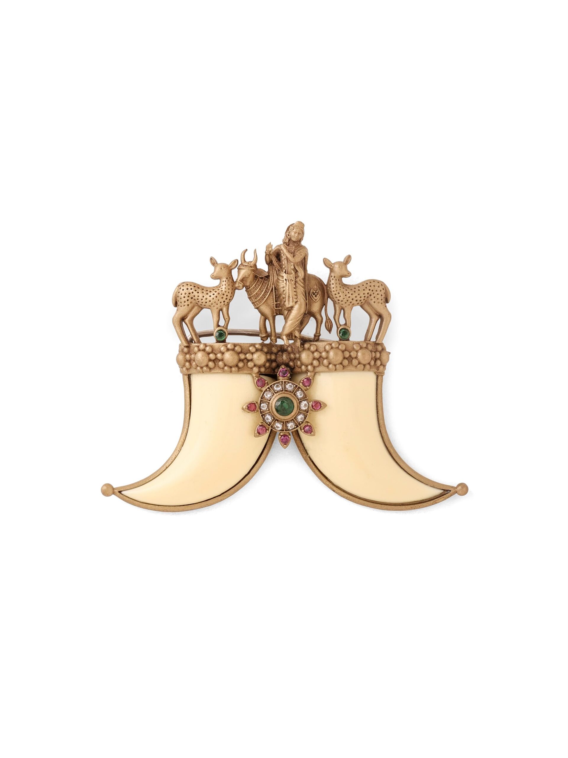 The Krishna?s Harmony Brooch beautifully captures the divine essence of Lord Krishna, serenading with his flute amidst a pastoral scene of a sacred cow and gentle deer. Resting on twin ivory-toned tusks, adorned with a gemstone floral motif at the center, this brooch symbolizes peace, love, and the eternal bond between divinity and nature. A striking piece of heritage artistry, it adds spiritual charm and royal elegance to men?s accessories.