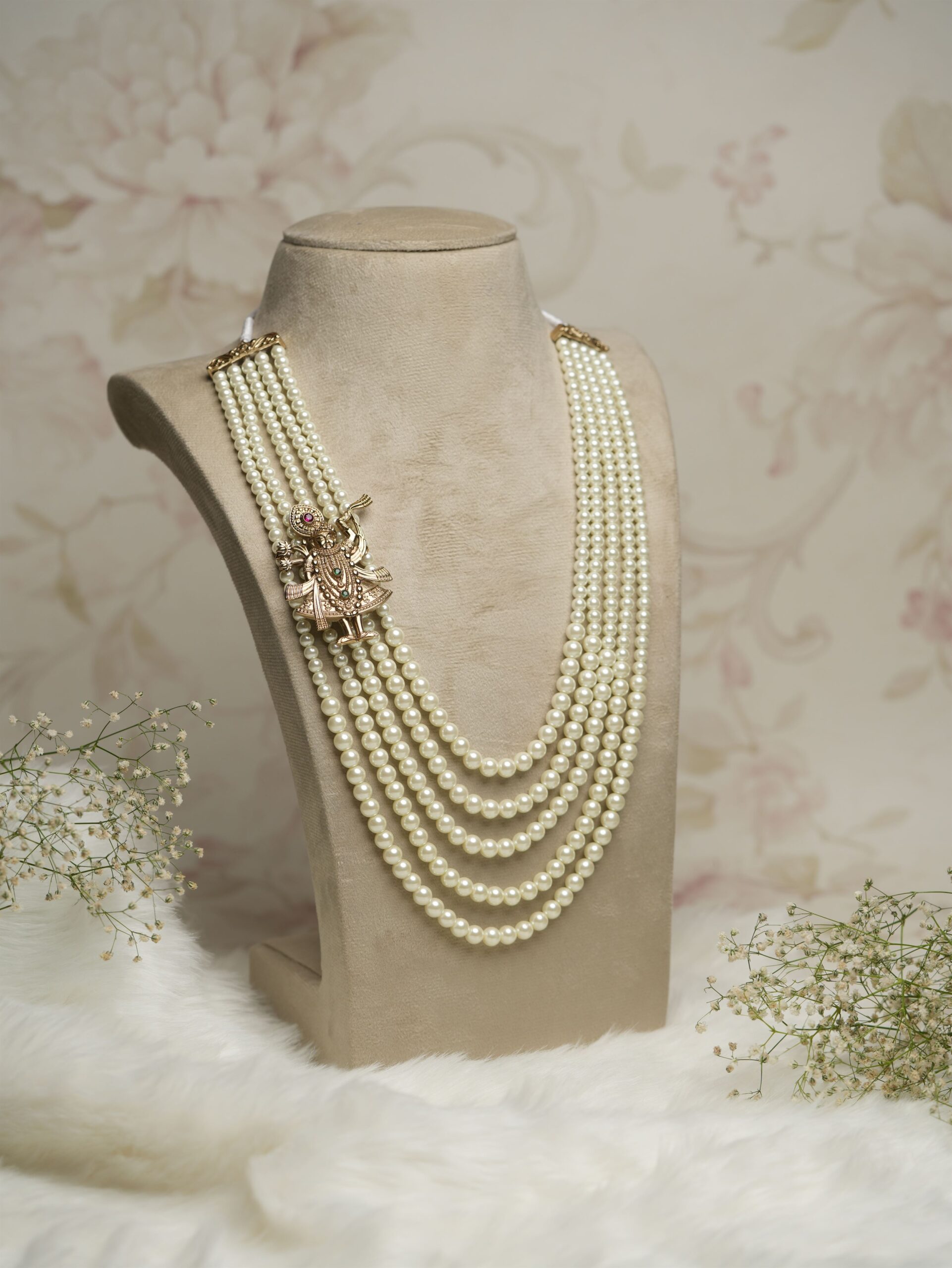 The Divine Shreenath Ji Pearl Haar is a spiritual and regal adornment, layered with luminous glass pearls that radiate purity and grace. At its heart rests an intricately crafted brass motif of Shreenath Ji, finished in antique gold plating and accented with delicate stonework, symbolizing devotion, protection, and divine blessings. Perfectly complementing the zari thread work of traditional sherwanis, this haar bridges faith and royalty. Designed for the modern maharaja, it is the ultimate jewel for ?The Great Indian Wedding,? where elegance meets divinity.
