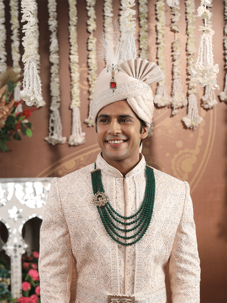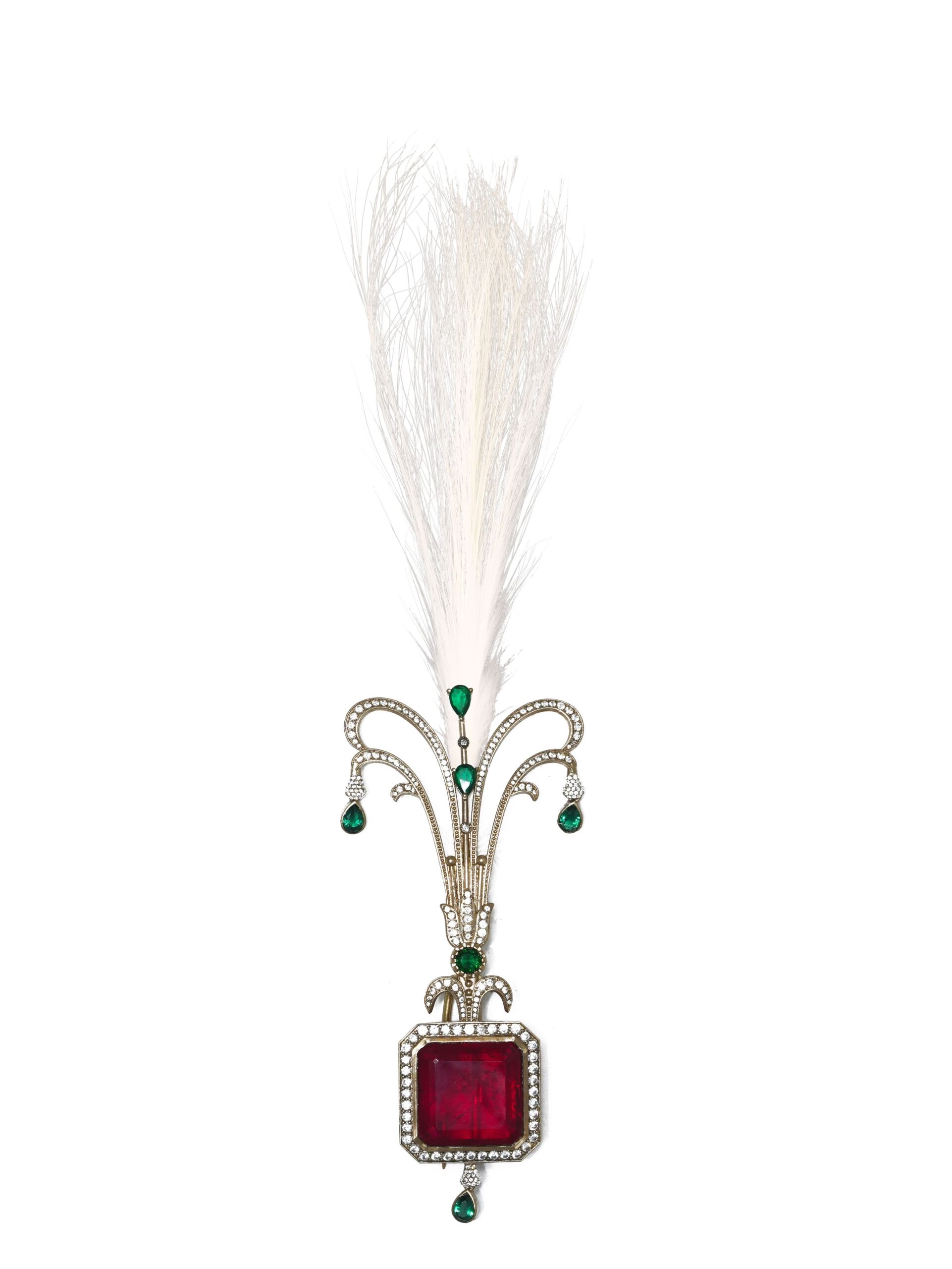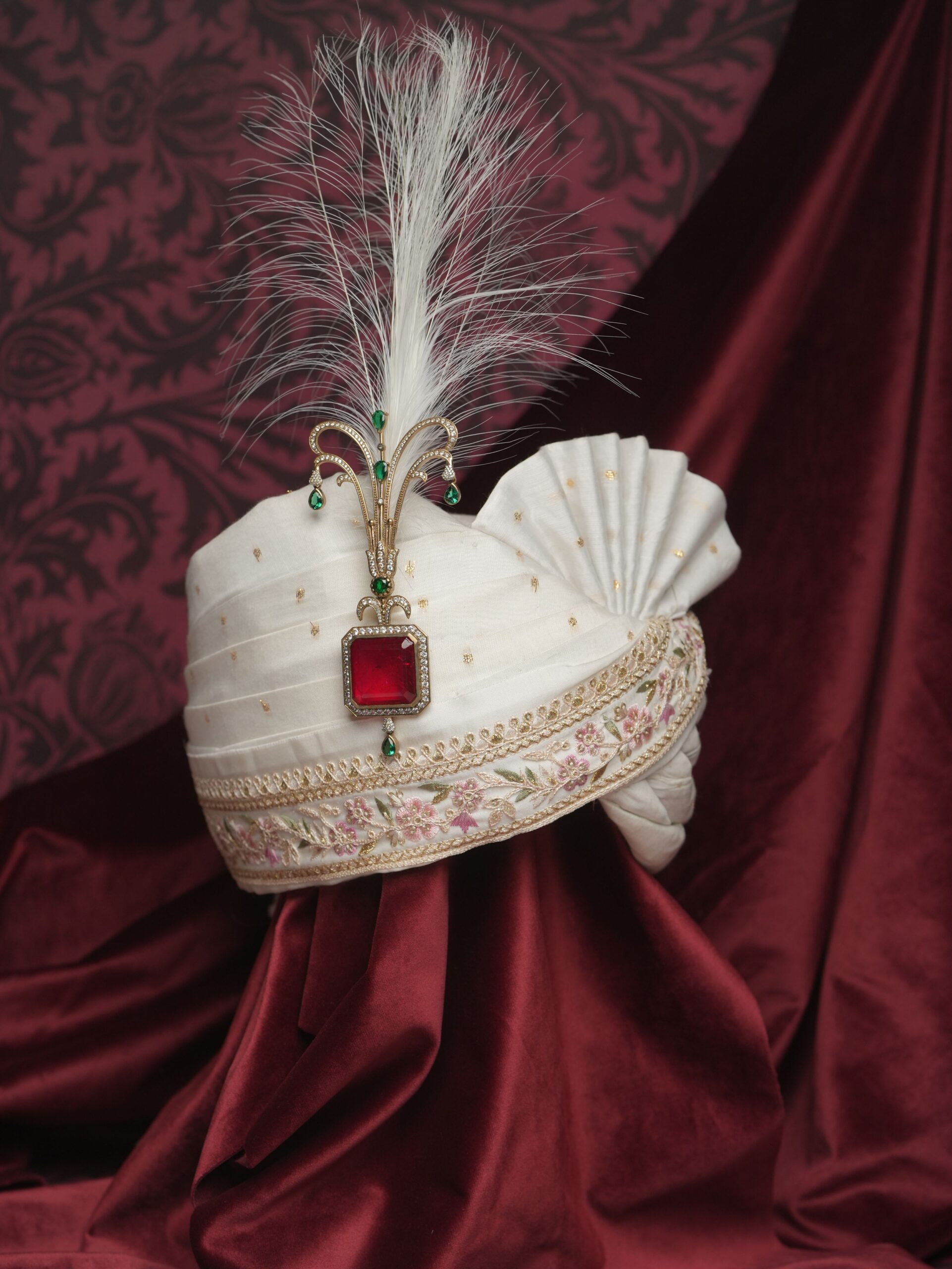 This Kalangi embodies the grandeur of royal heritage, designed to bring a majestic aura to the groom?s turban. At its center lies a striking square-cut ruby framed with brilliant stones, symbolizing strength and prosperity. The design extends into graceful arcs adorned with emerald embellishments, accented by sparkling white stones, creating a regal flourish.Crafted in fine brass with an antique gold finish, this piece is lightweight yet durable. The elegant plume at the top adds height and magnificence, making it a statement accessory for weddings and grand celebrations. A true emblem of tradition and nobility.