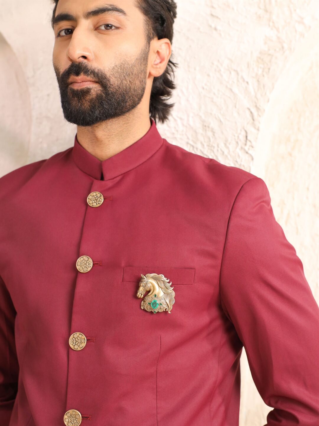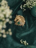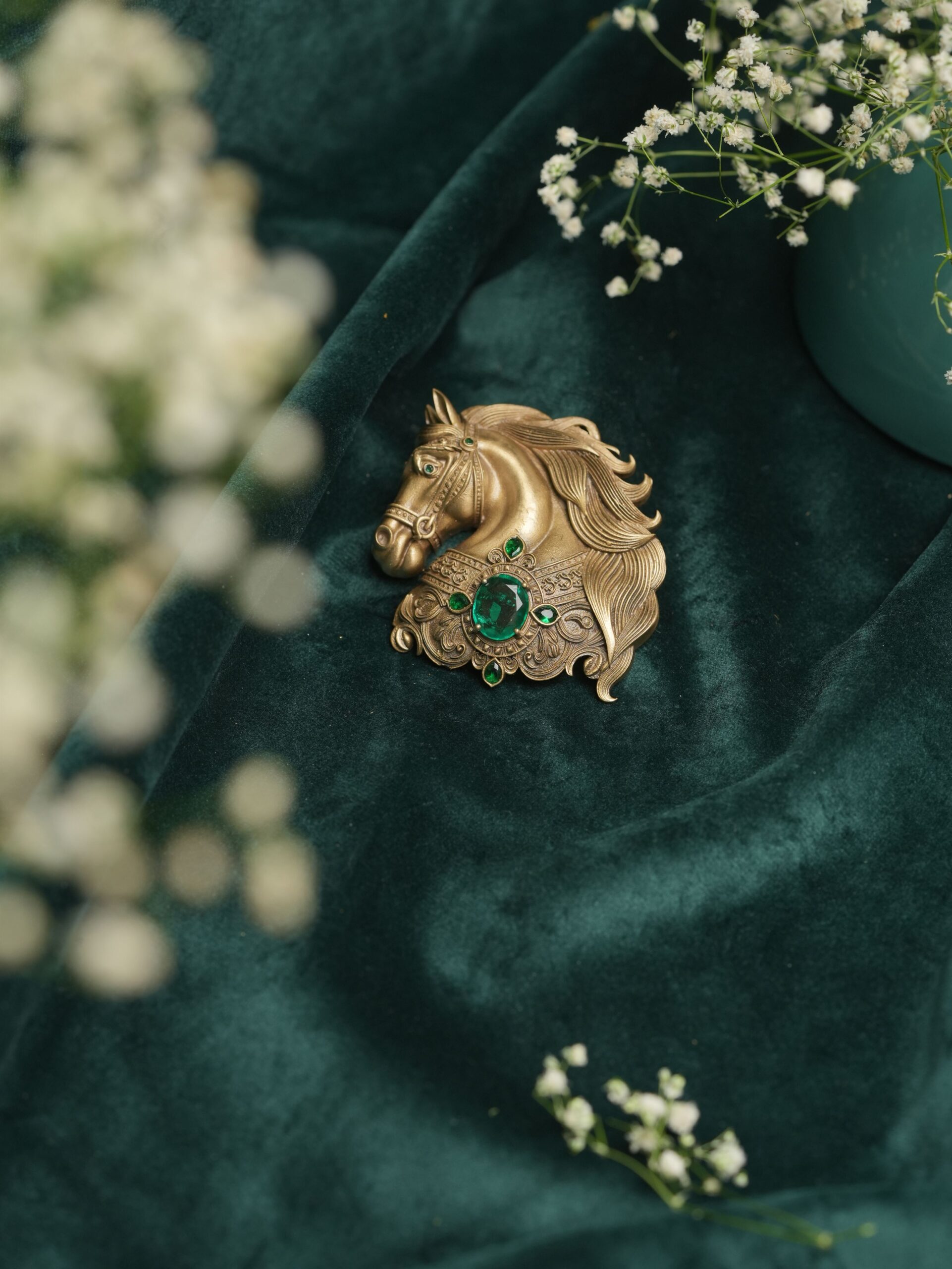 The Majestic Horse Emerald Brooch embodies strength, grace, and royal heritage. Crafted in antique-finished brass, the design highlights a beautifully detailed horse head with a flowing mane, symbolizing courage and loyalty.