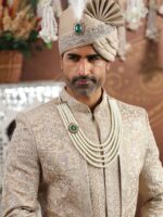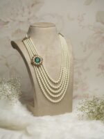 The Pearl Majesty Maala is a statement piece that embodies timeless elegance and regal grandeur. Designed with multiple layers of luminous pearls, it features a striking centerpiece adorned with a bold emerald surrounded by radiant pearls, set in intricate golden detailing. Perfect for grooms and men of distinction, this maala pairs beautifully with sherwanis, bandhgalas, and ethnic attire, making it an ideal choice for weddings and royal celebrations.