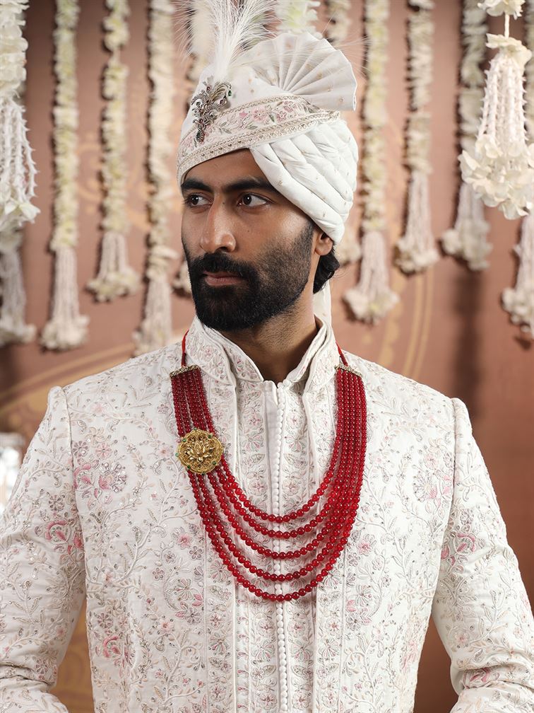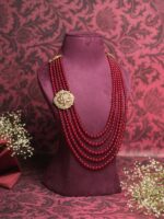 The Pichwai Lotus Ruby Mala is a masterpiece inspired by the timeless beauty of Pichwai art. Crafted with cascading strands of ruby-like glass beads, it radiates opulence and divine charm. At its center rests an ornate lotus motif in antique gold plating, detailed with polki-style embellishments and green accents that highlight its artistry. In Indian tradition, the lotus signifies purity, prosperity, and devotion ? core elements of Pichwai themes. Perfect for pairing with regal sherwanis, this mala is designed for the modern groom to embody heritage and grandeur at ?The Great Indian Wedding.?