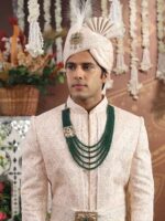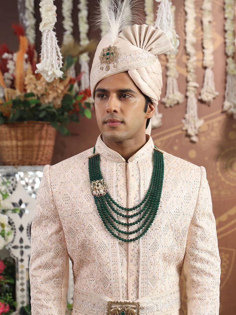 The Radha Krishna Emerald Mala is a divine expression of love, devotion, and timeless heritage. Crafted with layers of emerald-like glass beads, it exudes richness and serenity. At its center lies an intricately designed brass motif of Radha Krishna in antique gold plating, adorned with ruby-red and green stone accents. Symbolizing eternal love and divine blessings, the motif adds both spiritual depth and regal charm. Perfect for pairing with traditional sherwanis, this mala is crafted for the modern groom who wishes to embrace elegance, devotion, and grandeur at ?The Great Indian Wedding.?