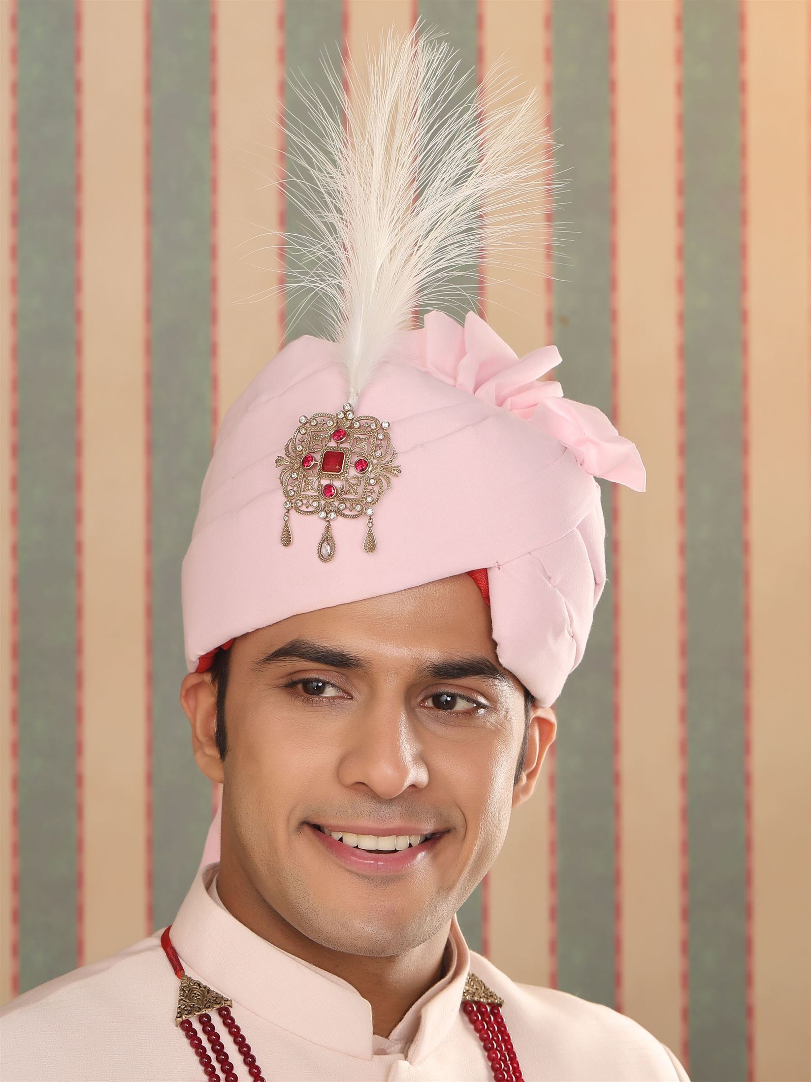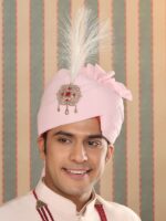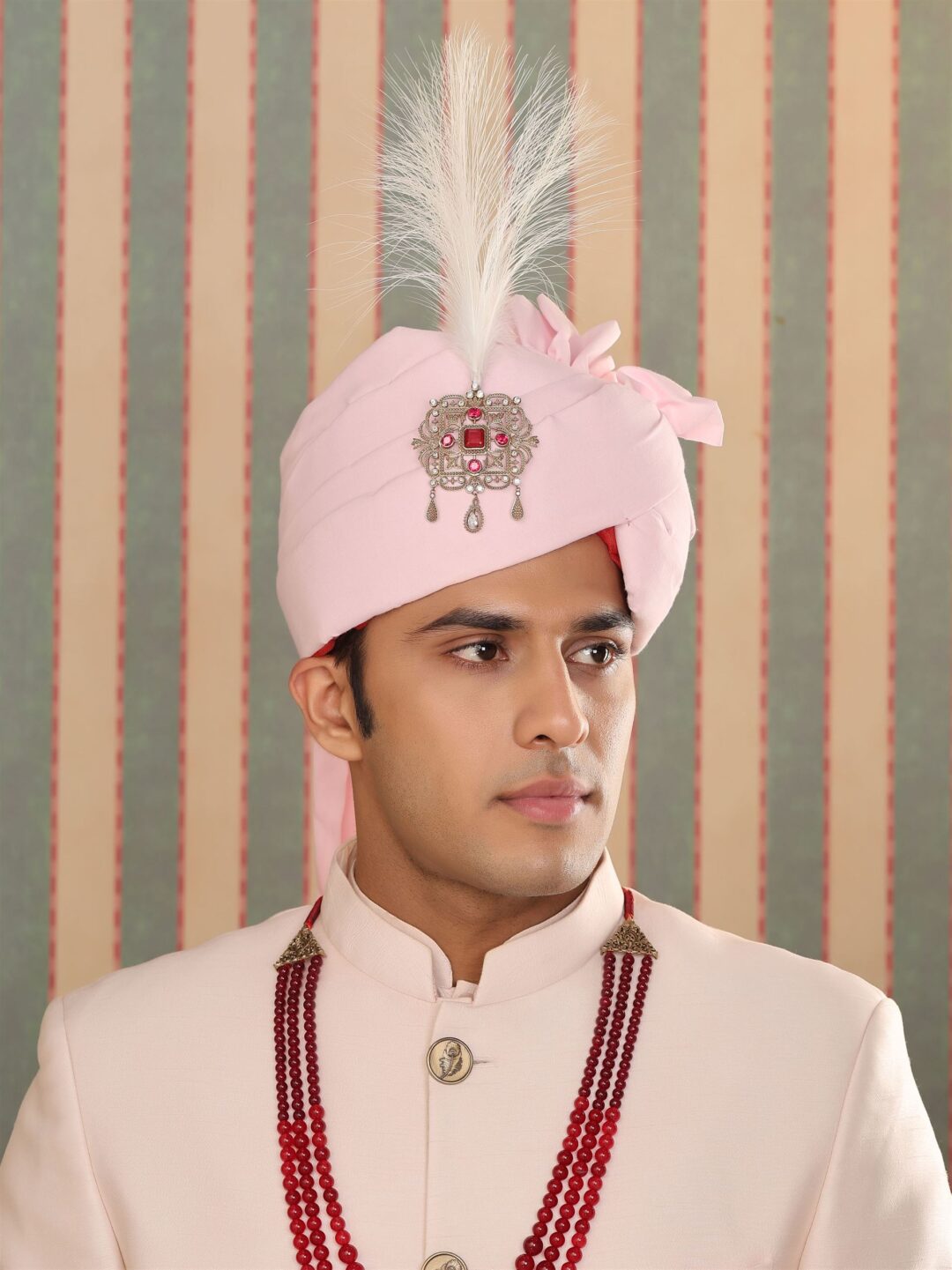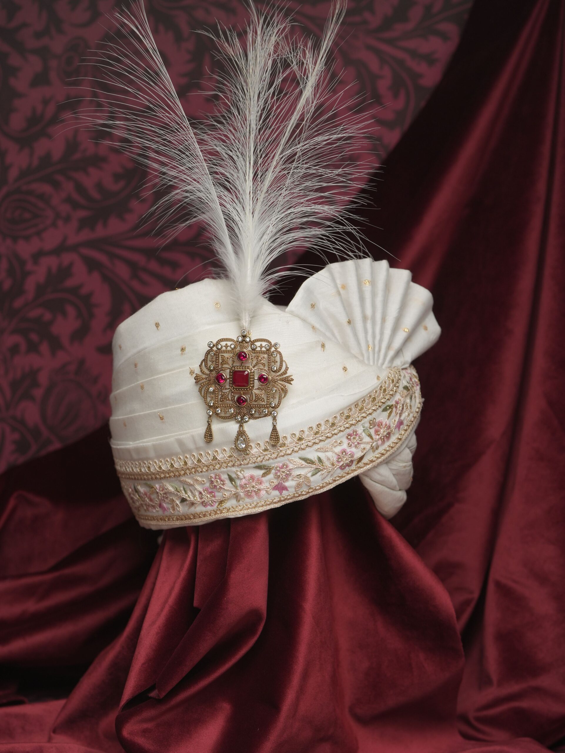 The Rajputana Ruby Kalangi is a statement of royal splendor and timeless tradition. Crafted in antique gold tones, the centerpiece is adorned with radiant ruby red stones framed in intricate filigree, highlighted with white kundan and dangling accents. The elegant plume of pristine white feathers adds a majestic flourish, symbolizing honor and pride. Perfect for grooms and ceremonial attire, this kalangi embodies the spirit of heritage with regal magnificence.
