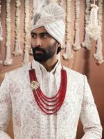 The Regal Ruby Maharaja Haar is a masterpiece of grandeur, layered with ruby-like glass beads in graduating sizes to create a majestic silhouette. At its heart rests an ornate brooch, handcrafted in brass with antique gold plating, harmonizing beautifully with the zari thread work found in most sherwanis. The intricate lion motif within the brooch symbolizes courage, power, and the regal spirit of a true king. Designed for the modern maharaja, this opulent haar is the perfect statement for ?The Great Indian Wedding.?