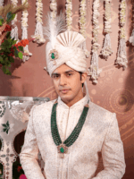 This kalangi is a tribute to Rajasthan?s royal heritage, where kalangis adorned with peacocks and gemstones were the crowning glory of regal attire. It embodies grace, grandeur, and the timeless artistry of traditional karigars.The Emerald Mayur Kalangi, crafted in fine brass with an antique gold finish, is beautifully detailed with twin peacocks framing a bold emerald-green stone centerpiece. Finished with delicate white feathers, it symbolizes purity and elegance, while the dangling motif adds movement and charm.Perfect for a groom?s turban or ceremonial wear, this kalangi is not just an ornament ? it is a regal statement of tradition, sophistication, and timeless pride.
